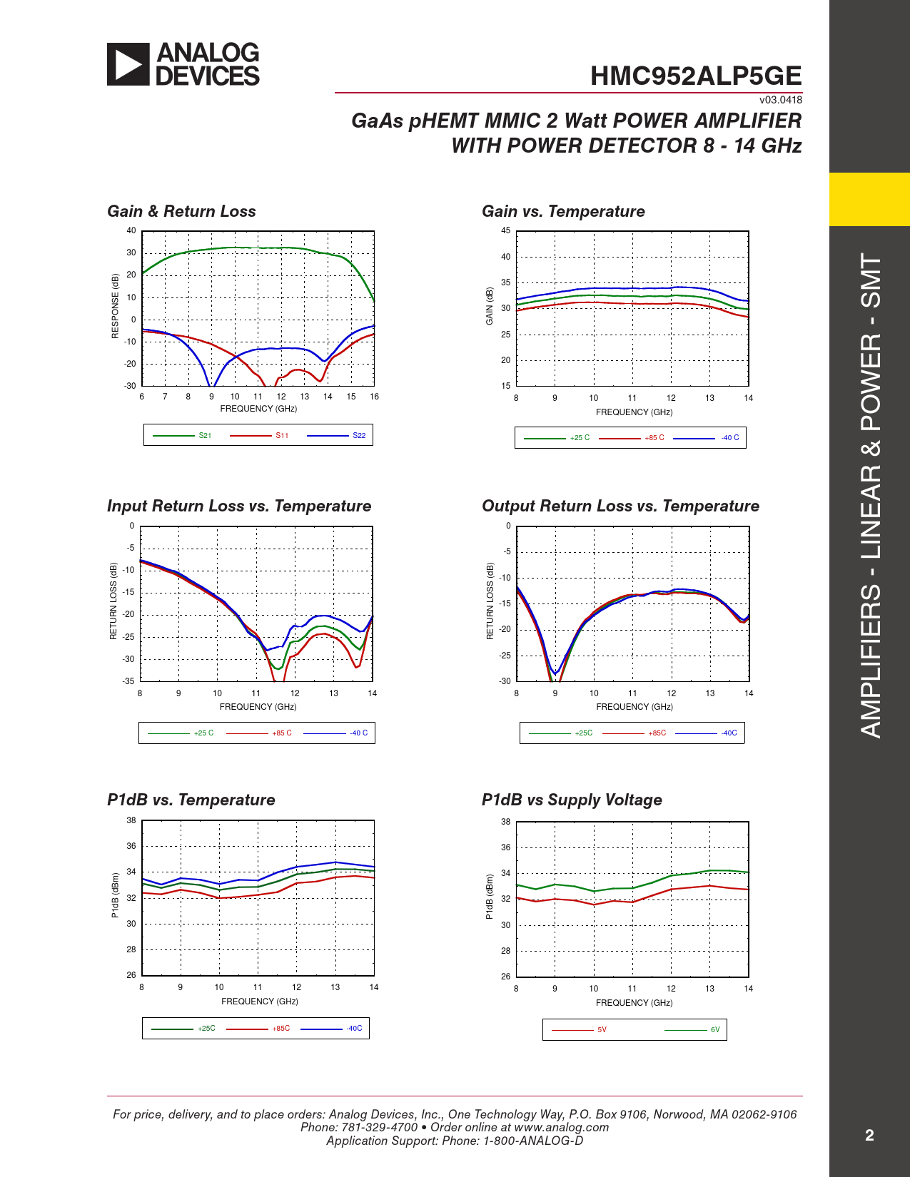 HMC952ALP5GE v03.0418 GaAs pHEMT MMIC 2 Watt POWER AMPLIFIERWITH POWER DETECTOR 8 - 14 GHzGain & Return LossGain vs. Temperature 40 45 30 40 T 20 B) 35 (d ) B m 10 SE d ( N 30 IN s 0 A G ESPO R 25 -10 r - -20 20 e -30 15 6 7 8 9 10 11 12 13 14 15 16 w 8 9 10 11 12 13 14 FREQUENCY (GHz) FREQUENCY (GHz) o S21 S11 S22 p +25 C +85 C -40 C r & A Input Return Loss vs. TemperatureOutput Return Loss vs. Temperature e 0 0 -5 -5 ) lin B -10 B (d (d -10 S S S -15 S O O L L -15 s - N N -20 UR UR r T T -20 RE -25 RE ie -30 -25 -35 -30 lif 8 9 10 11 12 13 14 8 9 10 11 12 13 14 p FREQUENCY (GHz) FREQUENCY (GHz) m +25 C +85 C -40 C +25C +85C -40C A P1dB vs. TemperatureP1dB vs Supply Voltage 38 38 36 36 ) 34 ) 34 m m (dB 32 (dB 32 1dB 1dB P P 30 30 28 28 26 26 8 9 10 11 12 13 14 8 9 10 11 12 13 14 FREQUENCY (GHz) FREQUENCY (GHz) +25C +85C -40C 5V 6V For price, delivery, and to place orders: Analog Devices, Inc., One Technology Way, P.O. Box 9106, Norwood, MA 02062-9106 Phone: 781-329-4700 • Order online at www.analog.com Application Support: Phone: 1-800-ANALOG-D 2 Document Outline Typical Applications Features Functional Diagram General Description Electrical Specifications Performance Characteristics Gain & Return Loss Gain vs. Temperature Input Return Loss vs. Temperature Output Return Loss vs. Temperature Low Frequency Gain & Return Loss Noise Figure vs. Frequency P1dB vs. Temperature Psat vs. Temperature P1dB vs. Vdd Psat vs. Vdd Output IP3 vs. Temperature @ Pout = 18 dBm Tone Output IP3 vs. Vdd @ Pout = 18 dBm Tone Power Compression @ 4 GHz Power Compression @ 10 GHz Power Compression @ 20 GHz Power Dissipation Second Harmonics vs. Temperature @ Pout = 18 dBm Second Harmonics vs. Vdd @ Pout = 18 dBm Second Harmonics vs. Pout Reverse Isolation vs Temperature Absolute Maximum Ratings Typical Supply Current vs. Vdd Outline Drawing Die Packaging Information Pad Descriptions Assembly Diagram Application Circuit