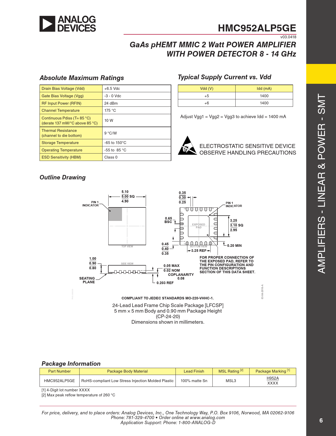 HMC952ALP5GE v03.0418 GaAs pHEMT MMIC 2 Watt POWER AMPLIFIERWITH POWER DETECTOR 8 - 14 GHzAbsolute Maximum RatingsTypical Supply Current vs. Vdd Drain Bias Voltage (Vdd) +6.5 Vdc Vdd (V) idd (mA) Gate Bias Voltage (Vgg) -3 - 0 Vdc +5 1400 T rf input power (rfin) 24 dBm +6 1400 m Channel Temperature 175 °C s Continuous pdiss (T= 85 °C) Adjust Vgg1 = Vgg2 = Vgg3 to achieve idd = 1400 mA 10 w (derate 137 mw/°C above 85 °C) Thermal resistance r - 9 °C/w (channel to die bottom) e storage Temperature -65 to 150°C eleCTrosTATiC sensiTiVe DeViCe w operating Temperature -55 to 85 °C oBserVe HAnDlinG preCAUTions o esD sensitivity (HBm) Class 0 p 24-Lead Lead Frame Chip Scale Package [LFCSP]5 x 5 mm Body and 0.90 mm Package Height(CP-24-20)Outline DrawingDimensions shown in millimeters r & A 5.100.35 e 5.00 SQ0.30PIN 14.900.25PIN 1INDICATORINDICATOR1924 lin 1810.65BSC3.25 s - EXPOSED3.10 SQPAD2.95 r 136 ie 0.45127TOP VIEW0.20 MIN0.40BOTTOM VIEW3.25 REF lif 0.351.00FOR PROPER CONNECTION OF p 0.90THE EXPOSED PAD, REFER TOSIDE VIEWTHE PIN CONFIGURATION AND m 0.800.05 MAX0.02 NOMFUNCTION DESCRIPTIONSSECTION OF THIS DATA SHEET. A COPLANARITYSEATING0.08PLANE0.203 REFPKG-000000COMPLIANT TO JEDEC STANDARDS MO-220-VHHC-1.03-04-2016-A 24-lead lead frame Chip scale package [lfCsp] 5 mm × 5 mm Body and 0.90 mm package Height (Cp-24-20) Dimensions shown in mil imeters. Package Information part number package Body material lead finish msl rating [2] package marking [1] H952A HmC952Alp5Ge roHs-compliant low stress injection molded plastic 100% matte sn msl3 XXXX [1] 4-Digit lot number XXXX [2] max peak reflow temperature of 260 °C For price, delivery, and to place orders: Analog Devices, Inc., One Technology Way, P.O. Box 9106, Norwood, MA 02062-9106 Phone: 781-329-4700 • Order online at www.analog.com Application Support: Phone: 1-800-ANALOG-D 6 Document Outline Typical Applications Features Functional Diagram General Description Electrical Specifications Performance Characteristics Gain & Return Loss Gain vs. Temperature Input Return Loss vs. Temperature Output Return Loss vs. Temperature Low Frequency Gain & Return Loss Noise Figure vs. Frequency P1dB vs. Temperature Psat vs. Temperature P1dB vs. Vdd Psat vs. Vdd Output IP3 vs. Temperature @ Pout = 18 dBm Tone Output IP3 vs. Vdd @ Pout = 18 dBm Tone Power Compression @ 4 GHz Power Compression @ 10 GHz Power Compression @ 20 GHz Power Dissipation Second Harmonics vs. Temperature @ Pout = 18 dBm Second Harmonics vs. Vdd @ Pout = 18 dBm Second Harmonics vs. Pout Reverse Isolation vs Temperature Absolute Maximum Ratings Typical Supply Current vs. Vdd Outline Drawing Die Packaging Information Pad Descriptions Assembly Diagram Application Circuit
