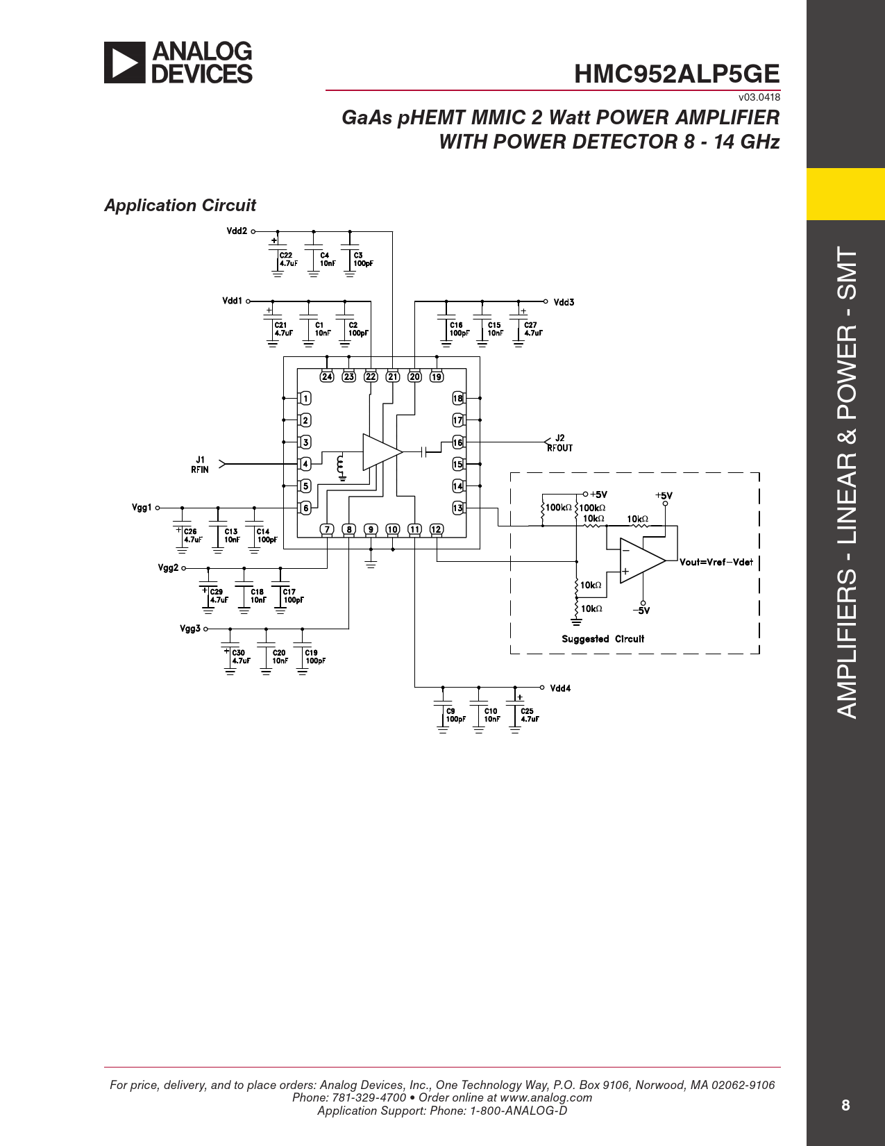 HMC952ALP5GE. GaAs pHEMT MMIC 2 Watt POWER AMPLIFIER. WITH POWER DETECTOR 8 - 14 GHz. Application Circuit