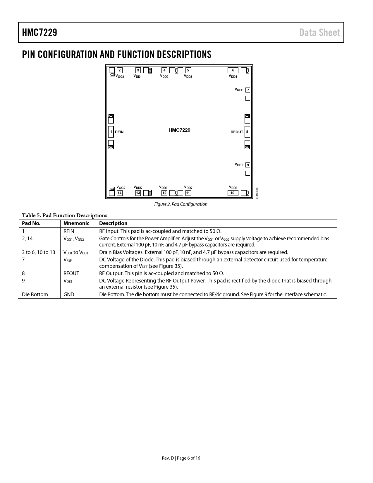 link to page 13 link to page 13 link to page 7 HMC7229Data SheetPIN CONFIGURATION AND FUNCTION DESCRIPTIONS23456VVVVGG1DD1VDD2DD3DD4VREF 7HMC72291 RFINRFOUT 8VDET 9VVVVGG2DD5VDD6DD7DD8 002 1413121110 14566- Figure 2. Pad Configuration Table 5. Pad Function Descriptions Pad No.MnemonicDescription 1 RFIN RF Input. This pad is ac-coupled and matched to 50 Ω. 2, 14 VGG1, VGG2 Gate Controls for the Power Amplifier. Adjust the VGG1 or VGG2 supply voltage to achieve recommended bias current. External 100 pF, 10 nF, and 4.7 μF bypass capacitors are required. 3 to 6, 10 to 13 VDD1 to VDD8 Drain Bias Voltages. External 100 pF, 10 nF, and 4.7 μF bypass capacitors are required. 7 VREF DC Voltage of the Diode. This pad is biased through an external detector circuit used for temperature compensation of VDET (see Figure 35). 8 RFOUT RF Output. This pin is ac-coupled and matched to 50 Ω. 9 VDET DC Voltage Representing the RF Output Power. This pad is rectified by the diode that is biased through an external resistor (see Figure 35). Die Bottom GND Die Bottom. The die bottom must be connected to RF/dc ground. See Figure 9 for the interface schematic. Rev. D | Page 6 of 16 Document Outline Features Applications General Description Functional Block Diagram Table of Contents Revision History Specifications 33 GHz to 35 GHz Frequency Range 35 GHz to 37 GHz Frequency Range 37 GHz to 40 GHz Frequency Range Absolute Maximum Ratings ESD Caution Pin Configuration and Function Descriptions Interface Schematics Typical Performance Characteristics Theory of Operation Applications Information Biasing Procedures Typical Application Circuit Mounting and Bonding Techniques for Millimeter Wave GaAs MMICs Handling Precautions Mounting Eutectic Die Attach Epoxy Die Attach Wire Bonding Assembly Diagram Outline Dimensions Ordering Guide