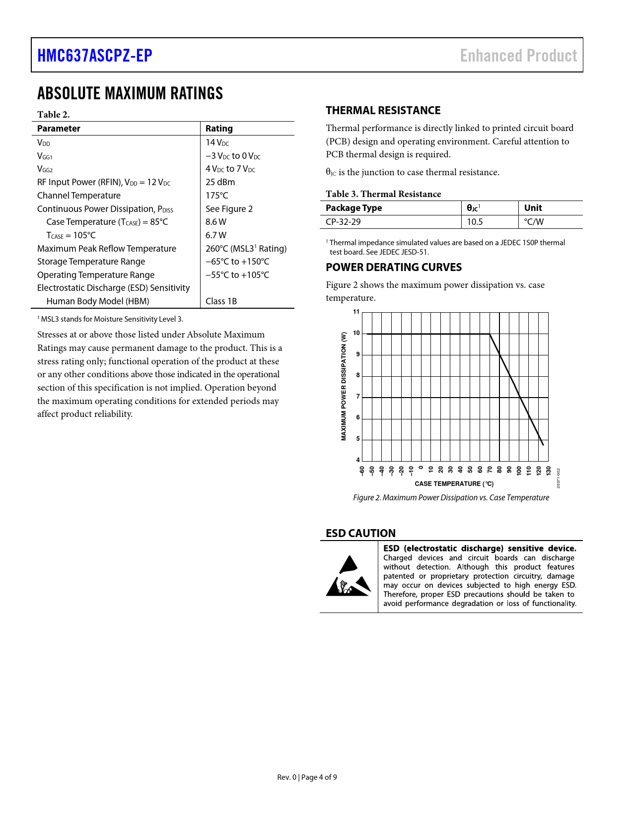 link to page 4 link to page 4 HMC637ASCPZ-EPEnhanced ProductABSOLUTE MAXIMUM RATINGS Table 2.THERMAL RESISTANCEParameterRating Thermal performance is directly linked to printed circuit board VDD 14 VDC (PCB) design and operating environment. Careful attention to VGG1 −3 VDC to 0 VDC PCB thermal design is required. VGG2 4 VDC to 7 VDC θJC is the junction to case thermal resistance. RF Input Power (RFIN), VDD = 12 VDC 25 dBm Channel Temperature 175°C Table 3. Thermal Resistance Continuous Power Dissipation, PDISS See Figure 2 Package TypeθJC 1 Unit Case Temperature (TCASE) = 85°C 8.6 W CP-32-29 10.5 °C/W TCASE = 105°C 6.7 W 1 Maximum Peak Reflow Temperature 260°C (MSL3 Thermal impedance simulated values are based on a JEDEC 1S0P thermal 1 Rating) test board. See JEDEC JESD-51. Storage Temperature Range −65°C to +150°C POWER DERATING CURVES Operating Temperature Range −55°C to +105°C Electrostatic Discharge (ESD) Sensitivity Figure 2 shows the maximum power dissipation vs. case Human Body Model (HBM) Class 1B temperature. 11 1 MSL3 stands for Moisture Sensitivity Level 3. Stresses at or above those listed under Absolute Maximum )10 Ratings may cause permanent damage to the product. This is a (W N IO stress rating only; functional operation of the product at these 9T PA or any other conditions above those indicated in the operational 8ISSI section of this specification is not implied. Operation beyond D ER the maximum operating conditions for extended periods may 7W affect product reliability. M PO6MU XIMA540102030405060708090–60–50–40–30–20–10100110120130 002 CASE TEMPERATURE (°C) 20371- Figure 2. Maximum Power Dissipation vs. Case Temperature ESD CAUTION Rev. 0 | Page 4 of 9 Document Outline FEATURES ENHANCED PRODUCT FEATURES APPLICATIONS FUNCTIONAL BLOCK DIAGRAM GENERAL DESCRIPTION TABLE OF CONTENTS REVISION HISTORY SPECIFICATIONS ELECTRICAL SPECIFICATIONS ABSOLUTE MAXIMUM RATINGS THERMAL RESISTANCE POWER DERATING CURVES ESD CAUTION PIN CONFIGURATION AND FUNCTION DESCRIPTIONS INTERFACE SCHEMATICS TYPICAL PERFORMANCE CHARACTERISTICS OUTLINE DIMENSIONS ORDERING GUIDE