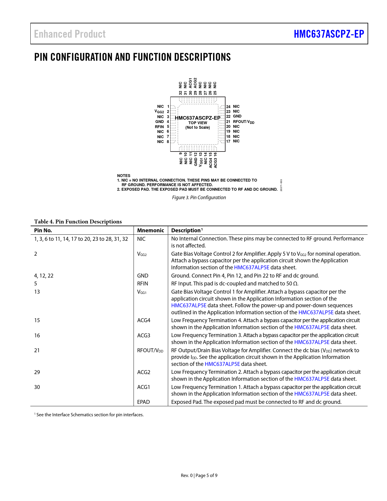 link to page 6 Enhanced ProductHMC637ASCPZ-EPPIN CONFIGURATION AND FUNCTION DESCRIPTIONS12CCCCCCNINIACGACGNINININI3231302928272625NIC124 NICVGG2 223 NICNIC 322 GNDHMC637ASCPZ-EPGND 421 RFOUT/VTOP VIEWDDRFIN 520 NIC(Not to Scale)NIC 619 NICNIC 718 NICNIC 817 NIC910111213141516CCCC43NINDNINIGGG1NIVACGACGNOTES 1. NIC = NO INTERNAL CONNECTION. THESE PINS MAY BE CONNECTED TO 003 RF GROUND. PERFORMANCE IS NOT AFFECTED. 2. EXPOSED PAD. THE EXPOSED PAD MUST BE CONNECTED TO RF AND DC GROUND. 20371- Figure 3. Pin Configuration Table 4. Pin Function Descriptions Pin No.Mnemonic Description1 1, 3, 6 to 11, 14, 17 to 20, 23 to 28, 31, 32 NIC No Internal Connection. These pins may be connected to RF ground. Performance is not affected. 2 VGG2 Gate Bias Voltage Control 2 for Amplifier. Apply 5 V to VGG2 for nominal operation. Attach a bypass capacitor per the application circuit shown the Application Information section of the HMC637ALP5E data sheet. 4, 12, 22 GND Ground. Connect Pin 4, Pin 12, and Pin 22 to RF and dc ground. 5 RFIN RF Input. This pad is dc-coupled and matched to 50 Ω. 13 VGG1 Gate Bias Voltage Control 1 for Amplifier. Attach a bypass capacitor per the application circuit shown in the Application Information section of the HMC637ALP5E data sheet. Follow the power-up and power-down sequences outlined in the Application Information section of the HMC637ALP5E data sheet. 15 ACG4 Low Frequency Termination 4. Attach a bypass capacitor per the application circuit shown in the Application Information section of the HMC637ALP5E data sheet. 16 ACG3 Low Frequency Termination 3. Attach a bypass capacitor per the application circuit shown in the Application Information section of the HMC637ALP5E data sheet. 21 RFOUT/VDD RF Output/Drain Bias Voltage for Amplifier. Connect the dc bias (VDD) network to provide IDD. See the application circuit shown in the Application Information section of the HMC637ALP5E data sheet. 29 ACG2 Low Frequency Termination 2. Attach a bypass capacitor per the application circuit shown in the Application Information section of the HMC637ALP5E data sheet. 30 ACG1 Low Frequency Termination 1. Attach a bypass capacitor per the application circuit shown in the Application Information section of the HMC637ALP5E data sheet. EPAD Exposed Pad. The exposed pad must be connected to RF and dc ground. 1 See the Interface Schematics section for pin interfaces. Rev. 0 | Page 5 of 9 Document Outline FEATURES ENHANCED PRODUCT FEATURES APPLICATIONS FUNCTIONAL BLOCK DIAGRAM GENERAL DESCRIPTION TABLE OF CONTENTS REVISION HISTORY SPECIFICATIONS ELECTRICAL SPECIFICATIONS ABSOLUTE MAXIMUM RATINGS THERMAL RESISTANCE POWER DERATING CURVES ESD CAUTION PIN CONFIGURATION AND FUNCTION DESCRIPTIONS INTERFACE SCHEMATICS TYPICAL PERFORMANCE CHARACTERISTICS OUTLINE DIMENSIONS ORDERING GUIDE