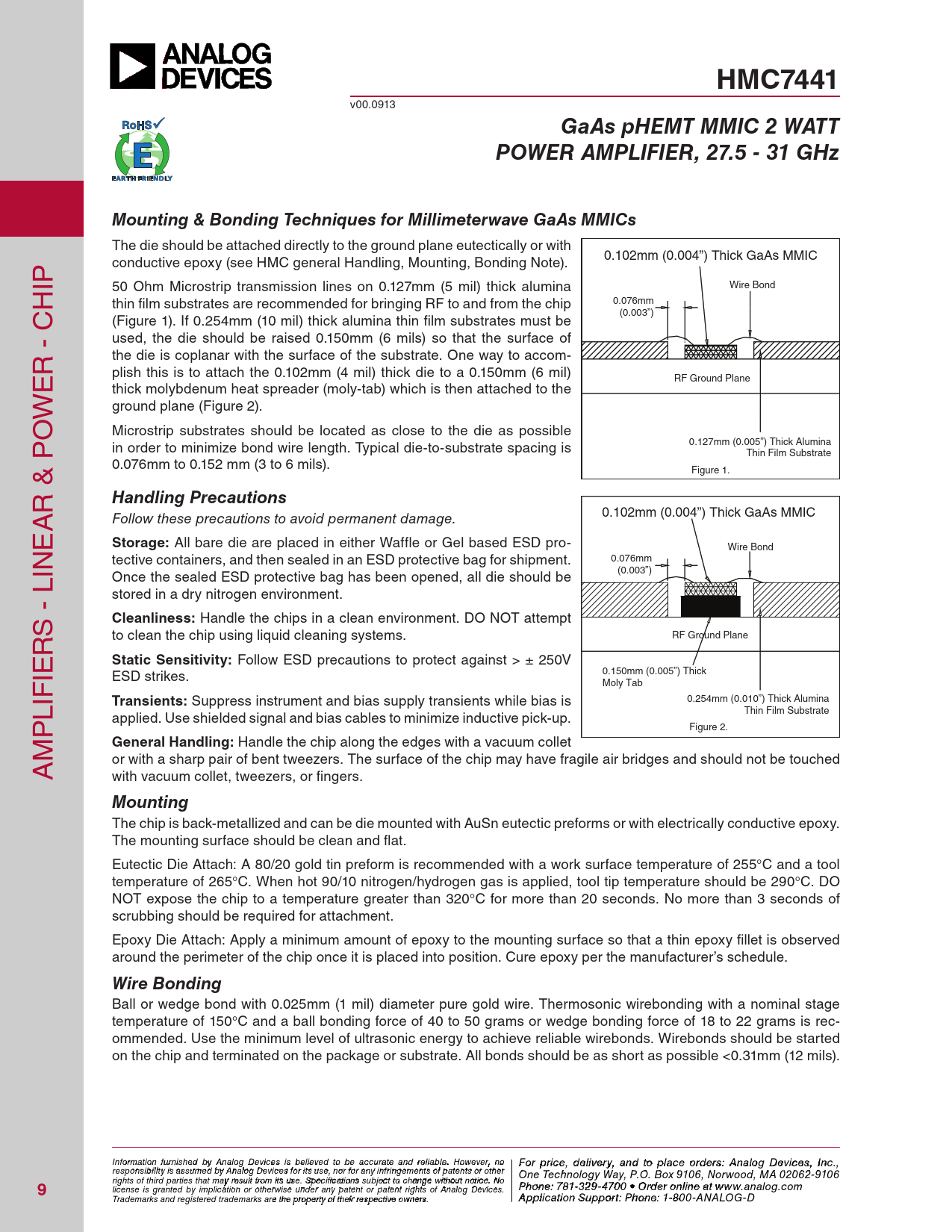 HMC7441 v00.0913 GaAs pHEMT MMIC 2 WATTPOWER AMPLIFIER, 27.5 - 31 GHzMounting & Bonding Techniques for Millimeterwave GaAs MMICs The die should be attached directly to the ground plane eutectical y or with conductive epoxy (see HMC general Handling, Mounting, Bonding Note). 0.102mm (0.004”) Thick GaAs MMIC IP H 50 Ohm Microstrip transmission lines on 0.127mm (5 mil) thick alumina Wire Bond thin film substrates are recommended for bringing RF to and from the chip 0.076mm (Figure 1). If 0.254mm (10 mil) thick alumina thin film substrates must be (0.003”) used, the die should be raised 0.150mm (6 mils) so that the surface of R - C the die is coplanar with the surface of the substrate. One way to accom- E plish this is to attach the 0.102mm (4 mil) thick die to a 0.150mm (6 mil) RF Ground Plane thick molybdenum heat spreader (moly-tab) which is then attached to the W ground plane (Figure 2). O Microstrip substrates should be located as close to the die as possible in order to minimize bond wire length. Typical die-to-substrate spacing is 0.127mm (0.005”) Thick Alumina Thin Film Substrate 0.076mm to 0.152 mm (3 to 6 mils). Figure 1. R & P Handling Precautions A Follow these precautions to avoid permanent damage. 0.102mm (0.004”) Thick GaAs MMIC E Storage: All bare die are placed in either Waffle or Gel based ESD pro- Wire Bond IN tective containers, and then sealed in an ESD protective bag for shipment. 0.076mm Once the sealed ESD protective bag has been opened, all die should be (0.003”) stored in a dry nitrogen environment. S - L Cleanliness: Handle the chips in a clean environment. DO NOT attempt R to clean the chip using liquid cleaning systems. RF Ground Plane IE Static Sensitivity: Fol ow ESD precautions to protect against > ± 250V ESD strikes. 0.150mm (0.005”) Thick Moly Tab LIF Transients: Suppress instrument and bias supply transients while bias is 0.254mm (0.010”) Thick Alumina Thin Film Substrate P applied. Use shielded signal and bias cables to minimize inductive pick-up. Figure 2. M General Handling: Handle the chip along the edges with a vacuum col et A or with a sharp pair of bent tweezers. The surface of the chip may have fragile air bridges and should not be touched with vacuum col et, tweezers, or fingers. Mounting The chip is back-metal ized and can be die mounted with AuSn eutectic preforms or with electrical y conductive epoxy. The mounting surface should be clean and flat. Eutectic Die Attach: A 80/20 gold tin preform is recommended with a work surface temperature of 255°C and a tool temperature of 265°C. When hot 90/10 nitrogen/hydrogen gas is applied, tool tip temperature should be 290°C. DO NOT expose the chip to a temperature greater than 320°C for more than 20 seconds. No more than 3 seconds of scrubbing should be required for attachment. Epoxy Die Attach: Apply a minimum amount of epoxy to the mounting surface so that a thin epoxy fil et is observed around the perimeter of the chip once it is placed into position. Cure epoxy per the manufacturer’s schedule. Wire Bonding Ball or wedge bond with 0.025mm (1 mil) diameter pure gold wire. Thermosonic wirebonding with a nominal stage temperature of 150°C and a ball bonding force of 40 to 50 grams or wedge bonding force of 18 to 22 grams is rec- ommended. Use the minimum level of ultrasonic energy to achieve reliable wirebonds. Wirebonds should be started on the chip and terminated on the package or substrate. All bonds should be as short as possible <0.31mm (12 mils). Inf F or o m r p atio r n ifc ur e n , d ishe e d lbiv y e A r n y a alog n D d t evic o p es is la beclie o eved rd to ebre sa: H ccur iattti e tae M nd re ilicarbloew . H a o ve C wever, o n rp o For price, delivery, and to place orders: Analog Devices, Inc., responsibility is assumed by Analog Devices for its use, nor for any infringements of patents or other oration, 2 Elizabeth Drive, Chelmsford, MA 01824 One Technology Way, P.O. Box 9106, Norwood, MA 02062-9106 Phone: 978-250-3343 Fax: 978-250-3373 O rights of third parties that may result from its use. Specifications subject to change without notice. No P rd hone e r O : 7 n 81- -3li 2n 9 e a -47 t w 0 w 0 • O w rd .h e it r o t niltie n .c e ao t m 9 license is granted by implication or otherwise under any patent or patent rights of Analog Devices. www.analog.com Application Support: Pho Trademarks and registered trademarks are the property of their respective owners. ne: 978-250-33 A 4 p 3 o plica r a tio p n S p u s p @ po h rt itt : P ite ho . n c e o : 1m -800-ANALOG-D