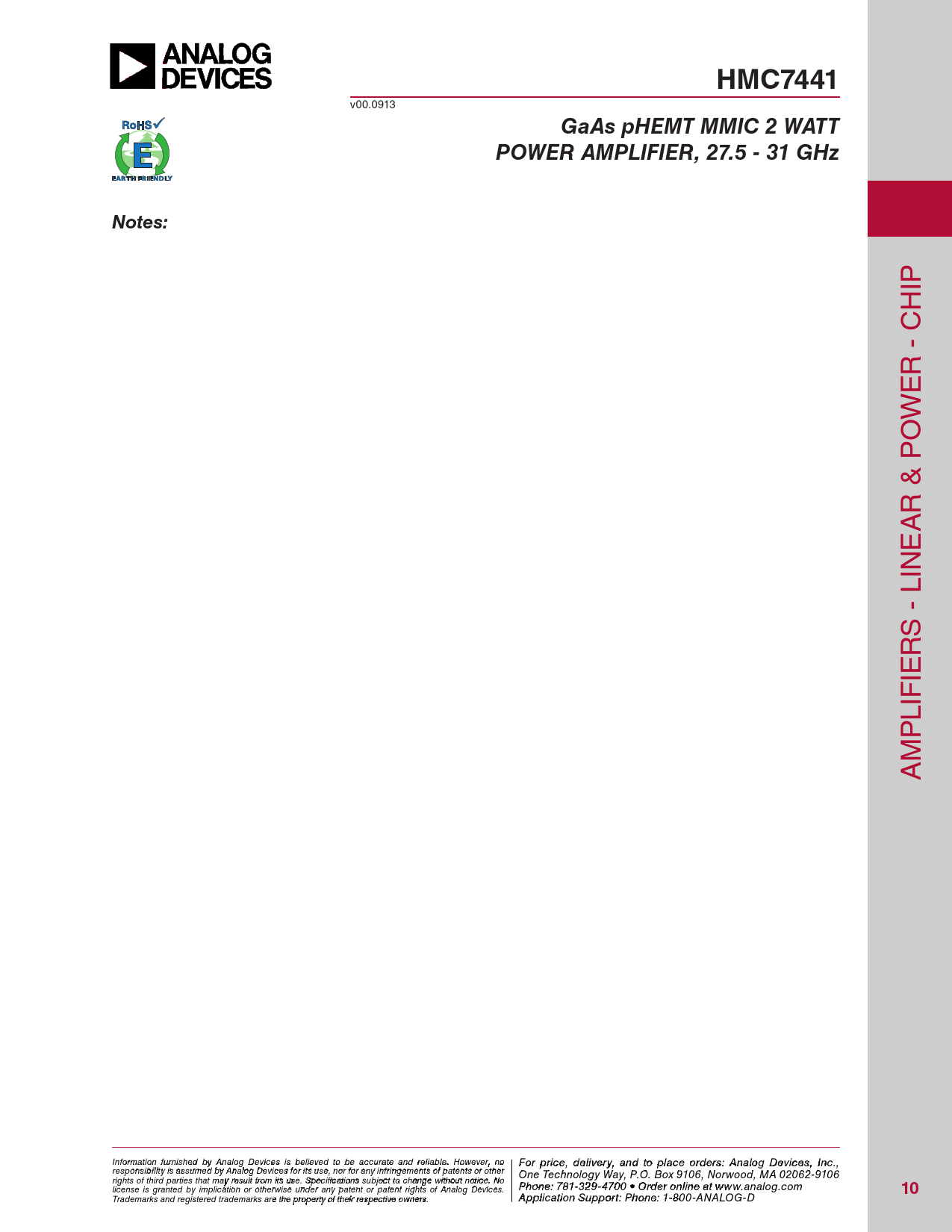 HMC7441 v00.0913 GaAs pHEMT MMIC 2 WATTPOWER AMPLIFIER, 27.5 - 31 GHzNotes: IP H R - C E W O R & P A E IN S - L R IE LIF P M A Inf F or o m r p atio r n ifc ur e n , d ishe e d lbiv y e A r n y a alog n D d t evic o p es is la beclie o eved rd to ebre sa: H ccur iattti e tae M nd re ilicarbloew . H a o ve C wever, o n rp o For price, delivery, and to place orders: Analog Devices, Inc., responsibility is assumed by Analog Devices for its use, nor for any infringements of patents or other oration, 2 Elizabeth Drive, Chelmsford, MA 01824 One Technology Way, P.O. Box 9106, Norwood, MA 02062-9106 Phone: 978-250-3343 Fax: 978-250-3373 O rights of third parties that may result from its use. Specifications subject to change without notice. No P rd hone e r O : 7 n 81- -3li 2n 9 e a -47 t w 0 w 0 • O w rd .h e it r o t niltie n .c e ao t m license is granted by implication or otherwise under any patent or patent rights of Analog Devices. www.analog.com 10 Application Support: Pho Trademarks and registered trademarks are the property of their respective owners. ne: 978-250-33 A 4 p 3 o plica r a tio p n S p u s p @ po h rt itt : P ite ho . n c e o : 1m -800-ANALOG-D