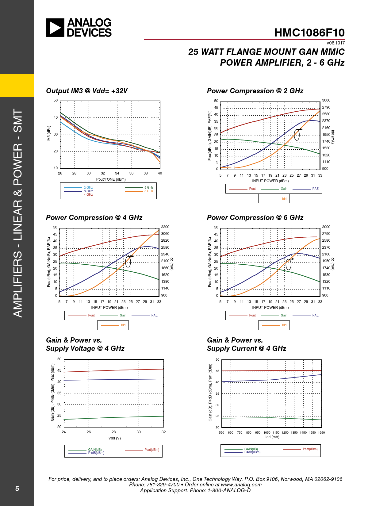 HMC1086F10 v06.1017 25 WATT FlAnge MounT gAn MMICPoWeR AMPlIFIeR, 2 - 6 gHzoutput IM3 @ Vdd= +32VPower Compression @ 2 gHz 50 50 3000 T 45 2790 ) (% 40 2580 m 40 E A 35 2370 s ) ), P 30 2160 Idd (dB (dBc 30 IN 25 1950 (mA) 3 A IM r - 20 1740 ), G m e 15 1530 20 10 1320 out(dB w P 5 1110 o 10 0 900 26 28 30 32 34 36 38 40 p 5 7 9 11 13 15 17 19 21 23 25 27 29 31 33 Pout/TONE (dBm) INPUT POWER (dBm) 2 GHz 5 GHz Pout Gain PAE 3 GHz 6 GHz 4 GHz r & Idd A e Power Compression @ 4 gHzPower Compression @ 6 gHz 50 3300 50 3000 lin 45 3060 45 2790 ) (% 40 2820 (% 40 2580 E E A 35 2580 A 35 2370 s - ), P ), P 30 2340 Idd 30 2160 Idd r (dB (dB IN 25 2100 (mA) IN 25 1950 (mA) A A ie 20 1860 ), G 20 1740 ), G m m 15 1620 15 1530 10 1380 10 1320 lif out(dB out(dB P P 5 1140 5 1110 p 0 900 0 900 m 5 7 9 11 13 15 17 19 21 23 25 27 29 31 33 5 7 9 11 13 15 17 19 21 23 25 27 29 31 33 A INPUT POWER (dBm) INPUT POWER (dBm) Pout Gain PAE Pout Gain PAE Idd Idd gain & Power vs.gain & Power vs.Supply Voltage @ 4 gHzSupply Current @ 4 gHz 50 50 ) m m 45 45 sat (dB sat (dB 40 ), P 40 ), P m m (dB 35 (dB 35 4dB 4dB 30 ), P 30 ), P 25 ain (dB 25 ain (dB G G 20 20 24 26 28 30 32 550 650 750 850 950 1050 1150 1250 1350 1450 1550 1650 Vdd (V) Idd (mA) GAIN(dB) Psat(dBm) GAIN(dB) Psat(dBm) P4dB(dBm) P4dB(dBm) For price, delivery, and to place orders: Analog Devices, Inc., One Technology Way, P.O. Box 9106, Norwood, MA 02062-9106 Phone: 781-329-4700 • Order online at www.analog.com 5 Application Support: Phone: 1-800-ANALOG-D Document Outline Typical Applications Features Functional Diagram General Description Electrical Specifications Performance Characteristics Gain & Return Loss Gain vs. Temperature Input Return Loss vs. Temperature Output Return Loss vs. Temperature Low Frequency Gain & Return Loss Noise Figure vs. Frequency P1dB vs. Temperature Psat vs. Temperature P1dB vs. Vdd Psat vs. Vdd Output IP3 vs. Temperature @ Pout = 18 dBm Tone Power Compression @ 10 GHz Power Dissipation Second Harmonics vs. Temperature @ Pout = 18 dBm Second Harmonics vs. Vdd @ Pout = 18 dBm Second Harmonics vs. Pout Absolute Maximum Ratings Typical Supply Current vs. Vdd Outline Drawing Die Packaging Information Pad Descriptions Assembly Diagram Application Circuit