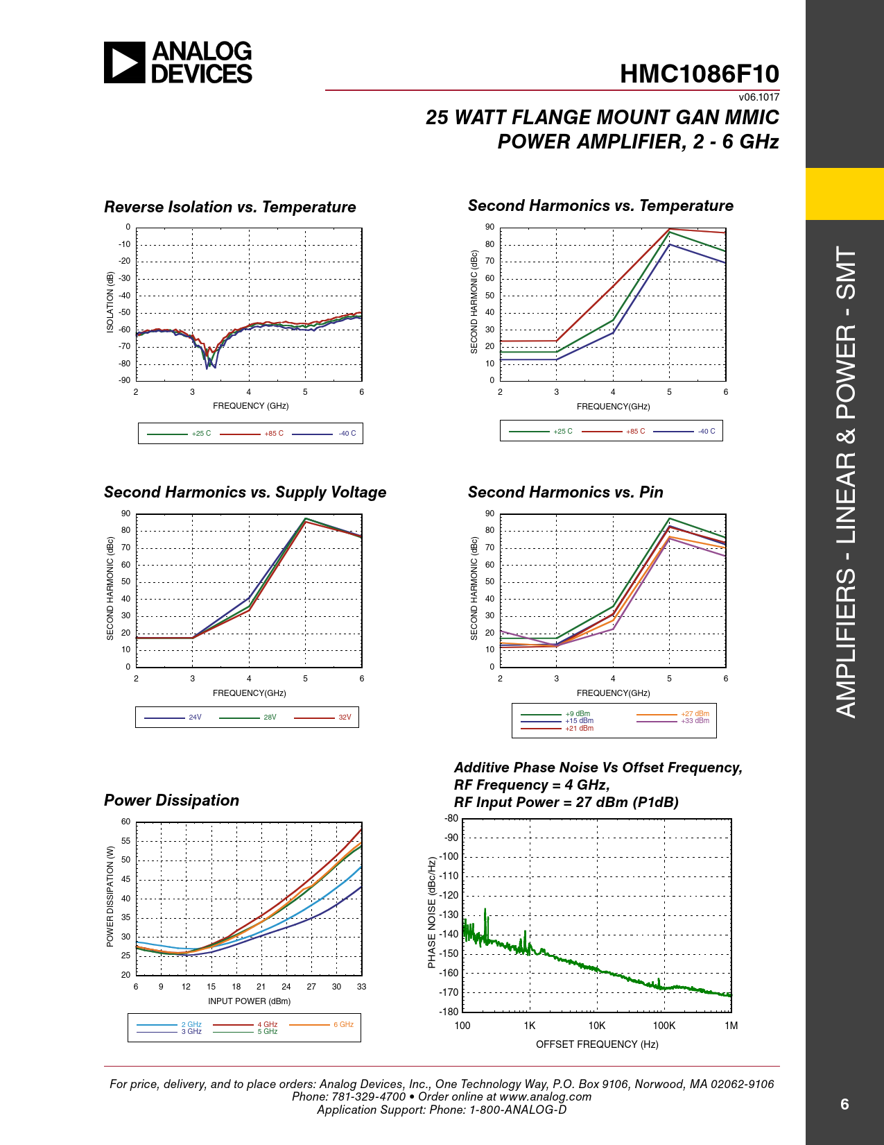 HMC1086F10 v06.1017 25 WATT FlAnge MounT gAn MMICPoWeR AMPlIFIeR, 2 - 6 gHzReverse Isolation vs. TemperatureSecond Harmonics vs. Temperature 0 90 -10 80 -20 70 T ) (dBc) -30 C 60 (dB m N -40 50 IO s T -50 LA HARMONI 40 O IS -60 30 r - -70 20 SECOND e -80 10 -90 0 w 2 3 4 5 6 2 3 4 5 6 FREQUENCY (GHz) o FREQUENCY(GHz) p +25 C +85 C -40 C +25 C +85 C -40 C r & A Second Harmonics vs. Supply VoltageSecond Harmonics vs. Pin e 90 90 80 80 70 70 lin (dBc) (dBc) C 60 C 60 50 50 s - HARMONI 40 HARMONI 40 r 30 30 ie 20 SECOND 20 SECOND 10 10 lif 0 0 2 3 4 5 6 2 3 4 5 6 p FREQUENCY(GHz) FREQUENCY(GHz) m 24V 28V 32V +9 dBm +27 dBm +15 dBm +33 dBm A +21 dBm Additive Phase noise Vs offset Frequency, RF Frequency = 4 gHz,Power DissipationRF Input Power = 27 dBm (P1dB) 60 -80 55 -90 (W) 50 ) -100 z /H 45 -110 Bc 40 (d -120 DISSIPATION 35 ISE -130 O N 30 -140 POWER 25 ASE -150 PH 20 -160 6 9 12 15 18 21 24 27 30 33 -170 INPUT POWER (dBm) -180 2 GHz 4 GHz 6 GHz 100 1K 10K 100K 1M 3 GHz 5 GHz OFFSET FREQUENCY (Hz) For price, delivery, and to place orders: Analog Devices, Inc., One Technology Way, P.O. Box 9106, Norwood, MA 02062-9106 Phone: 781-329-4700 • Order online at www.analog.com Application Support: Phone: 1-800-ANALOG-D 6 Document Outline Typical Applications Features Functional Diagram General Description Electrical Specifications Performance Characteristics Gain & Return Loss Gain vs. Temperature Input Return Loss vs. Temperature Output Return Loss vs. Temperature Low Frequency Gain & Return Loss Noise Figure vs. Frequency P1dB vs. Temperature Psat vs. Temperature P1dB vs. Vdd Psat vs. Vdd Output IP3 vs. Temperature @ Pout = 18 dBm Tone Power Compression @ 10 GHz Power Dissipation Second Harmonics vs. Temperature @ Pout = 18 dBm Second Harmonics vs. Vdd @ Pout = 18 dBm Second Harmonics vs. Pout Absolute Maximum Ratings Typical Supply Current vs. Vdd Outline Drawing Die Packaging Information Pad Descriptions Assembly Diagram Application Circuit