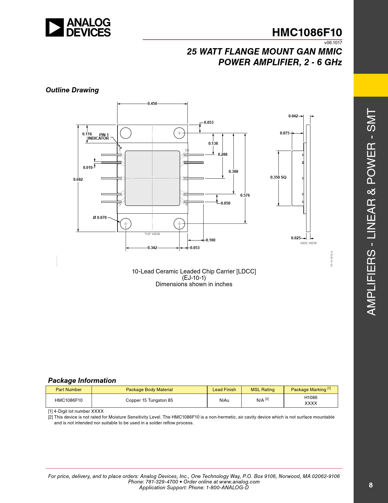 HMC1086F10 v06.1017 25 WATT FlAnge MounT gAn MMICPoW10-Lead Ceramic Leaded Chip Carrier [LDCC]eR AMPlIFIeR, 2 - 6 gHz(EJ-10-1)Dimensions shown in inchesoutline Drawing0.4500.042 T 0.053 m s 0.116PIN 10.075INDICATOR0.138110 r - 0.288 e 0.010 w 0.3880.350 SQ o 0.682 p 0.5760.05056 r & A Ø 0.070 e TOP VIEW0.1000.025 lin SIDE VIEW0.3420.05316 s - PKG-005104-14-2016-A r 10-lead Ceramic leaded Chip Carrier [lDCC] ie (eJ-10-1) Dimensions shown in inches lif p m A Package Information part number package Body material lead finish msl rating package marking [1] HmC1086f10 Copper 15 Tungston 85 niAu n/A [2] H1086 XXXX [1] 4-Digit lot number XXXX [2] This device is not rated for moisture sensitivity level. The HmC1086f10 is a non-hermetic, air cavity device which is not surface mountable and is not intended nor suitable to be used in a solder reflow process. For price, delivery, and to place orders: Analog Devices, Inc., One Technology Way, P.O. Box 9106, Norwood, MA 02062-9106 Phone: 781-329-4700 • Order online at www.analog.com Application Support: Phone: 1-800-ANALOG-D 8 Document Outline Typical Applications Features Functional Diagram General Description Electrical Specifications Performance Characteristics Gain & Return Loss Gain vs. Temperature Input Return Loss vs. Temperature Output Return Loss vs. Temperature Low Frequency Gain & Return Loss Noise Figure vs. Frequency P1dB vs. Temperature Psat vs. Temperature P1dB vs. Vdd Psat vs. Vdd Output IP3 vs. Temperature @ Pout = 18 dBm Tone Power Compression @ 10 GHz Power Dissipation Second Harmonics vs. Temperature @ Pout = 18 dBm Second Harmonics vs. Vdd @ Pout = 18 dBm Second Harmonics vs. Pout Absolute Maximum Ratings Typical Supply Current vs. Vdd Outline Drawing Die Packaging Information Pad Descriptions Assembly Diagram Application Circuit