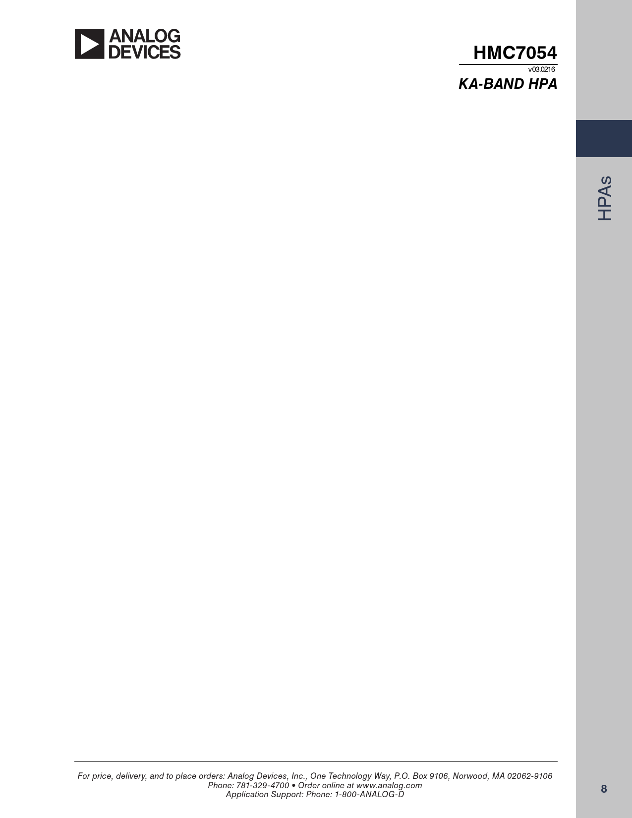 HMC7054 v03.0216 Ka-Band HPa s PA H For price, delivery, and to place orders: Analog Devices, Inc., One Technology Way, P.O. Box 9106, Norwood, MA 02062-9106 Phone: 781-329-4700 • Order online at www.analog.com 8 Application Support: Phone: 1-800-ANALOG-D Document Outline Features Functional Block Diagram Electrical Specifications Small Signal Gain Output P1dB & PAE Saturated Output Power Linear Power (SRG) IP3 Absolute Maximum Ratings Outline Drawing Table 1. Absolute Maximum Ratings Table 2. J1 HPA Connector Pin Out Table 3. J2 BUC Connector Pin Out