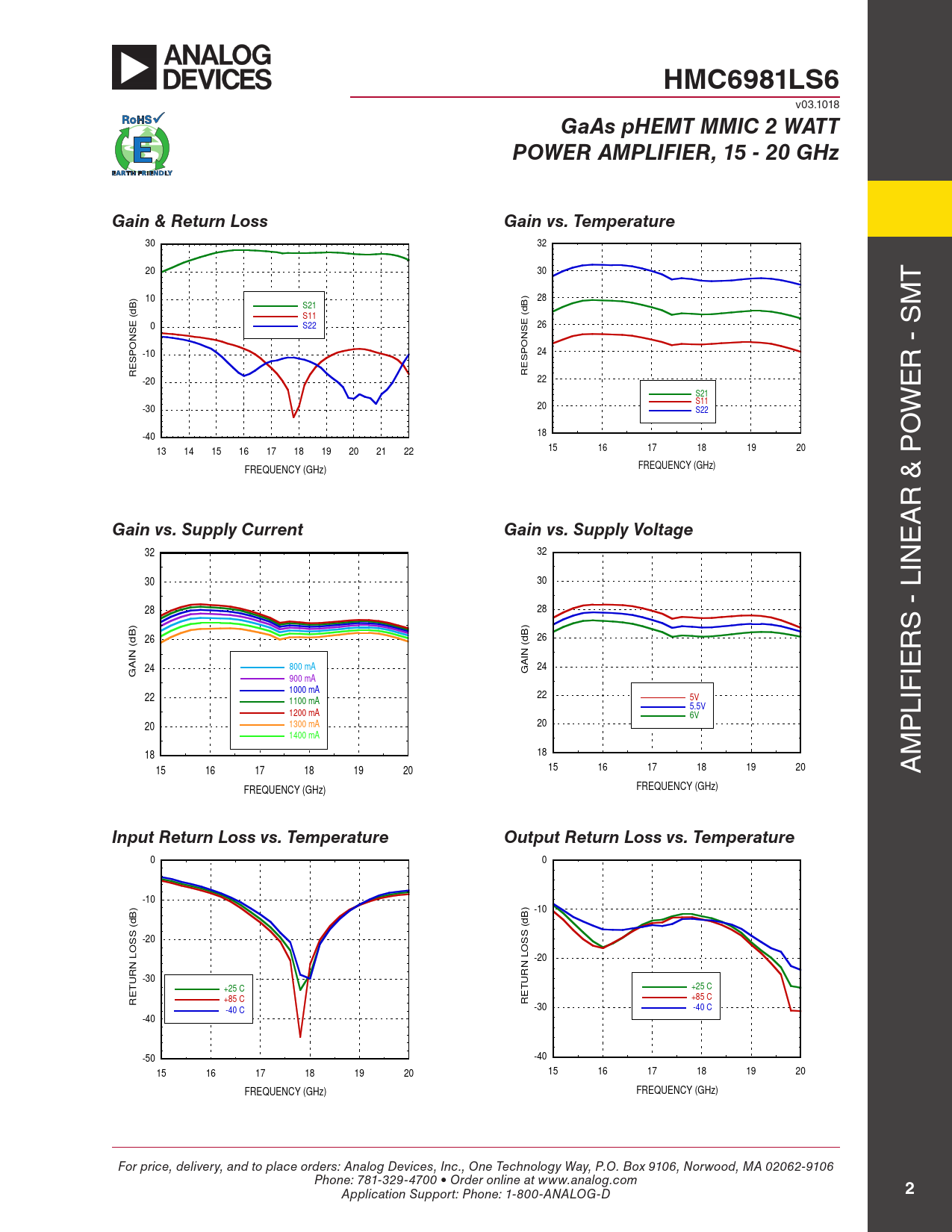 HMC6981LS6. GaAs pHEMT MMIC 2 WATT. POWER AMPLIFIER, 15 - 20 GHz. Gain & Return Loss. Gain vs. Temperature