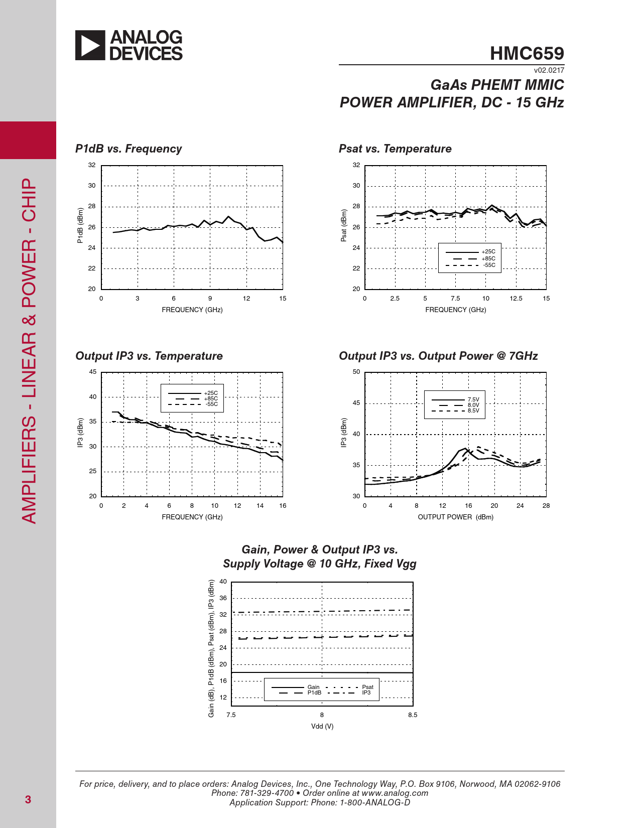 40 (dBm) 36 IP3 32 (dBm), 28 Psat 24 (dBm), 20 16 P1dB Gain Psat P1dB IP3 12 (dB), Gain 7.5 8 8.5 Vdd (V) For price, delivery, and to place orders: Analog Devices, Inc., One Technology Way, P.O. Box 9106, Norwood, MA 02062-9106 Phone: 781-329-4700 • Order online at www.analog.com