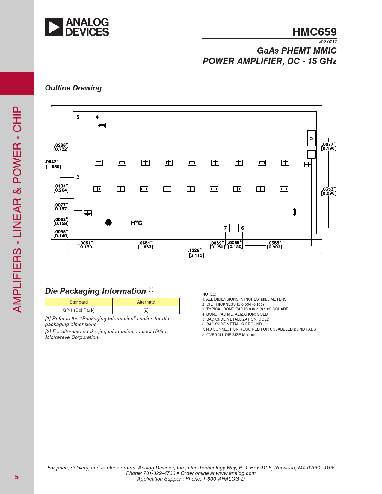 HMC659 v02.0217 GaAs PHEMT MMICPOWER AMPLIFIER, DC - 15 GHzOutline Drawing IP H R - C E W O R & P A E IN S - L R IE LIF P Die Packaging Information [1] NOTES: M 1. ALL DIMENSIONS IN INCHES [MILLIMETERS] Standard Alternate A 2. DIE THICKNESS IS 0.004 (0.100) 3. TYPICAL BOND PAD IS 0.004 (0.100) SQUARE GP-1 (Gel Pack) [2] 4. BOND PAD METALIZATION: GOLD [1] Refer to the “Packaging Information” section for die 5. BACKSIDE METALLIZATION: GOLD packaging dimensions. 6. BACKSIDE METAL IS GROUND 7. NO CONNECTION REQUIRED FOR UNLABELED BOND PADS [2] For alternate packaging information contact Hittite 8. OVERALL DIE SIZE IS ±.002 Microwave Corporation. For price, delivery, and to place orders: Analog Devices, Inc., One Technology Way, P.O. Box 9106, Norwood, MA 02062-9106 Phone: 781-329-4700 • Order online at www.analog.com 5 Application Support: Phone: 1-800-ANALOG-D