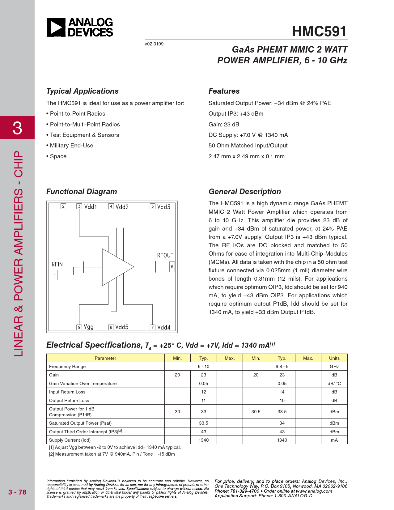 HMC591. GaAs PHEMT MMIC 2 WATT. POWER AMPLIFIER, 6 - 10 GHz. Typical Applications. Features. Functional Diagram