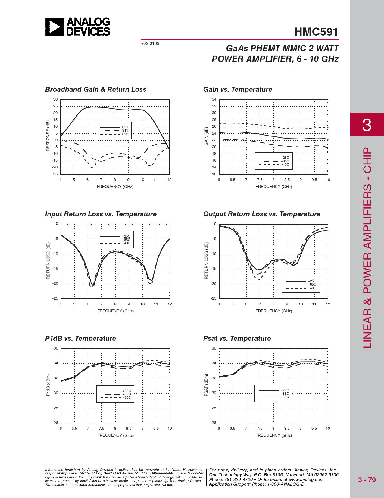 HMC591. GaAs PHEMT MMIC 2 WATT. POWER AMPLIFIER, 6 - 10 GHz. Broadband Gain & Return Loss. Gain vs. Temperature
