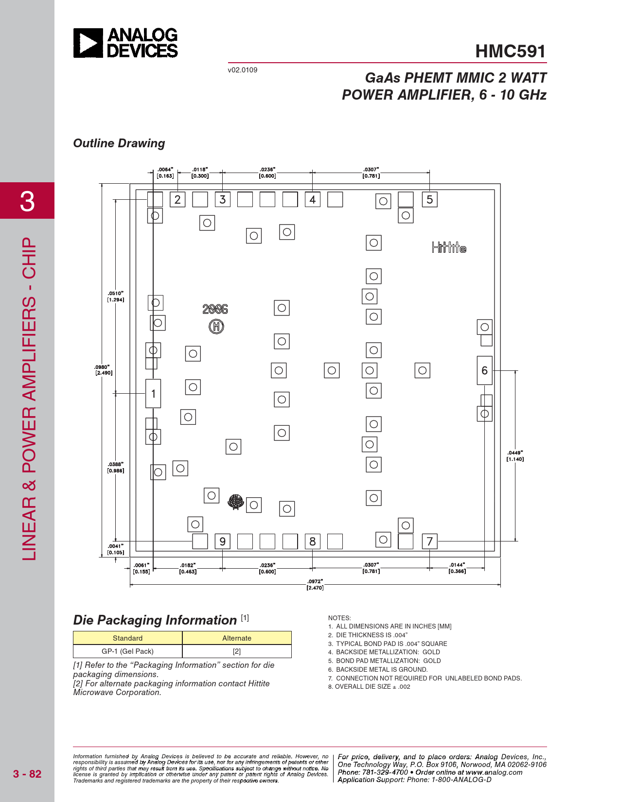 HMC591. GaAs PHEMT MMIC 2 WATT. POWER AMPLIFIER, 6 - 10 GHz. Outline Drawing. Die Packaging Information. 3 - 82