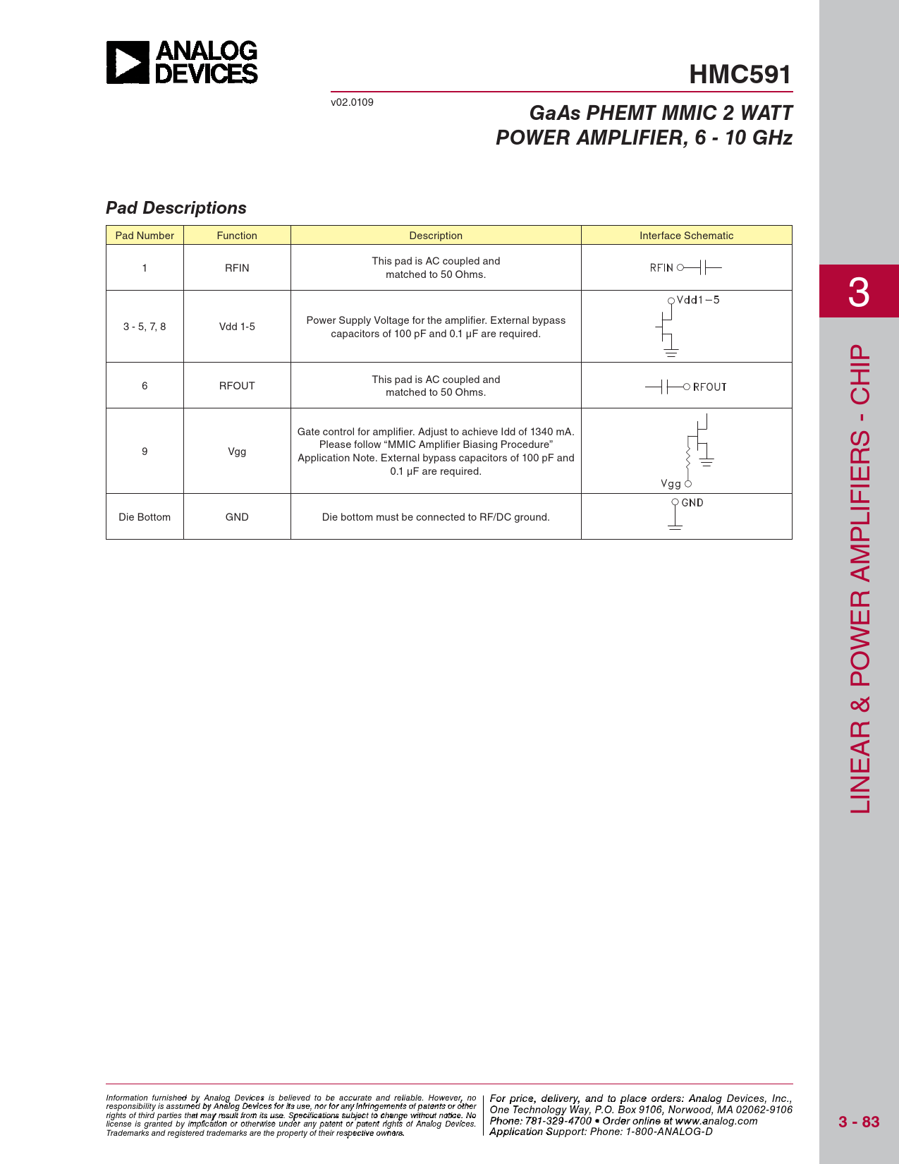 HMC591. GaAs PHEMT MMIC 2 WATT. POWER AMPLIFIER, 6 - 10 GHz. Pad Descriptions. 3 - 83