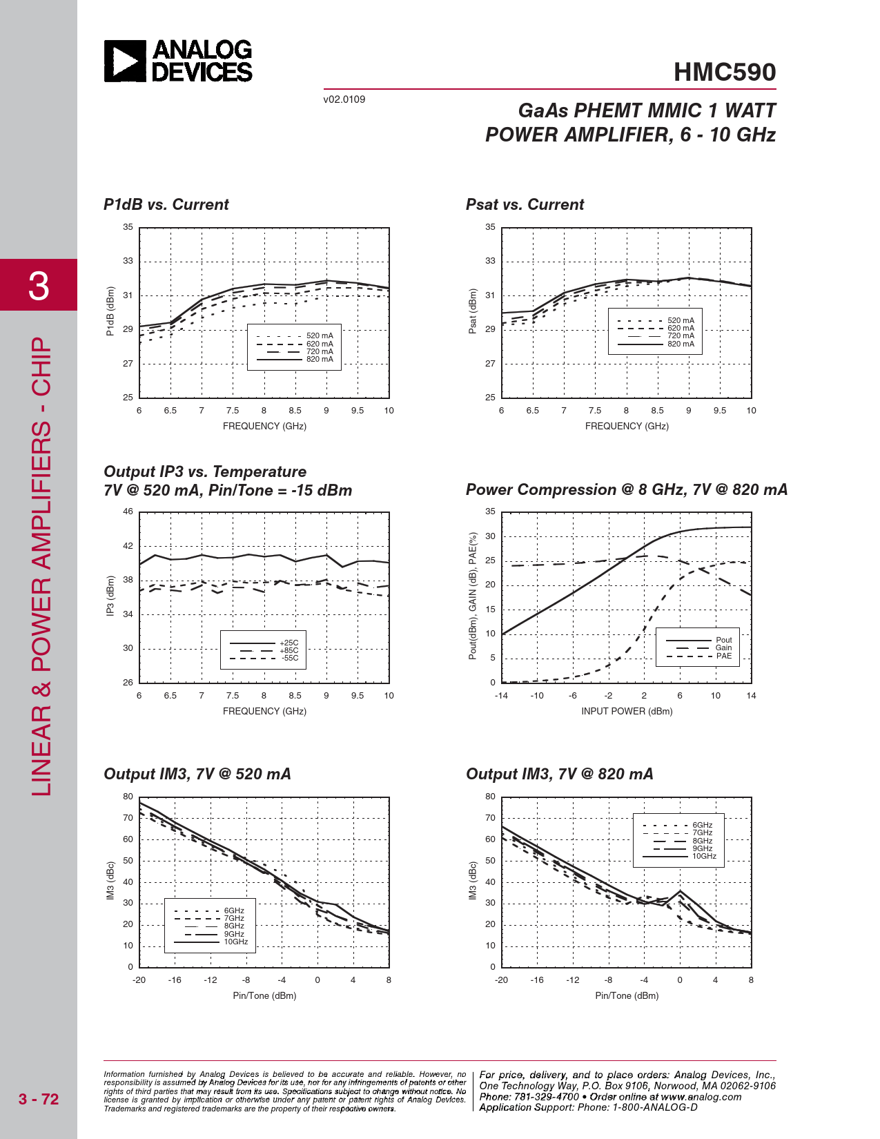 HMC590 GaAs PHEMT MMIC 1 WATT POWER AMPLIFIER, 6 - 10 GHz P1dB vs Current Psat vs Current Output IP3 vs Temperature