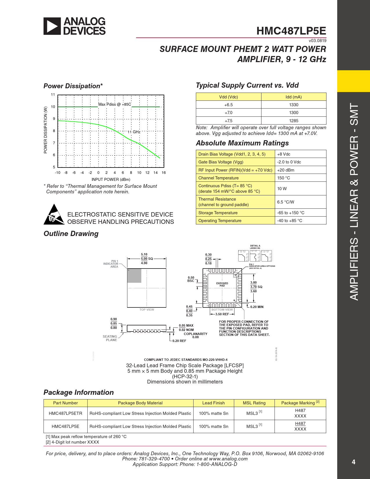 HMC487LP5E v03.0819 SURFACE MOUNT PHEMT 2 WATT POWERAMPLIFIER, 9 - 12 GHzPower Dissipation*Typical Supply Current vs. Vdd 11 Vdd (Vdc) Idd (mA) Max Pdiss @ +85C +6.5 1330 ) 10 T (W +7.0 1300 N IO 9 M +7.5 1285 PAT Note: Amplifier will operate over full voltage ranges shown 8 11 GHz ISSI above. Vgg adjusted to achieve Idd= 1300 mA at +7.0V. D ER 7 Absolute Maximum Ratings R - S W E PO 6 Drain Bias Voltage (Vdd1, 2, 3, 4, 5) +8 Vdc W Gate Bias Voltage (Vgg) -2.0 to 0 Vdc 5 O RF Input Power (RFIN)(Vdd = +7.0 Vdc) +20 dBm -10 -8 -6 -4 -2 0 2 4 6 8 10 12 14 16 Channel Temperature 150 °C INPUT POWER (dBm) * Refer to “Thermal Management for Surface Mount Continuous Pdiss (T= 85 °C) 10 W Components” application note herein. (derate 154 mW/°C above 85 °C) R & P Thermal Resistance 6.5 °C/W (channel to ground paddle) A E Storage Temperature -65 to +150 °C ELECTROSTATIC SENSITIVE DEVICE Operating Temperature -40 to +85 °C OBSERVE HANDLING PRECAUTIONS IN 32-Lead Lead Frame Chip Scale Package [LFCSP]5 x 5 mm Body and 0.85 mm Package HeightOutline Drawing(HCP-32-1)Dimensions shown in millimetersDETAIL A S - L (JEDEC 95) R 5.100.305.00 SQ0.25PIN 1INDICATOR4.900.18 IE PIN 1INDICATOR AREA OPTIONSAREA(SEE DETAIL A)25322410.50 LIF BSCEXPOSED3.80PAD P 3.70 SQ3.60 M 178 A 1690.450.20 MINTOP VIEWBOTTOM VIEW0.400.353.50 REF0.900.85FOR PROPER CONNECTION OF0.05 MAXTHE EXPOSED PAD, REFER TO0.800.02 NOMTHE PIN CONFIGURATION ANDCOPLANARITYFUNCTION DESCRIPTIONSSEATING0.08SECTION OF THIS DATA SHEET.PLANE0.20 REFPKG-004898COMPLIANT TO JEDEC STANDARDS MO-220-VHHD-402-19-2019-B 32-Lead Lead Frame Chip Scale Package [LFCSP] 5 mm × 5 mm Body and 0.85 mm Package Height (HCP-32-1) Dimensions shown in mil imeters Package Information Part Number Package Body Material Lead Finish MSL Rating Package Marking [2] HMC487LP5ETR RoHS-compliant Low Stress Injection Molded Plastic 100% matte Sn MSL3 [1] H487 XXXX HMC487LP5E RoHS-compliant Low Stress Injection Molded Plastic 100% matte Sn MSL3 [1] H487 XXXX [1] Max peak reflow temperature of 260 °C [2] 4-Digit lot number XXXX For price, delivery, and to place orders: Analog Devices, Inc., One Technology Way, P.O. Box 9106, Norwood, MA 02062-9106 Phone: 781-329-4700 • Order online at www.analog.com Application Support: Phone: 1-800-ANALOG-D 4