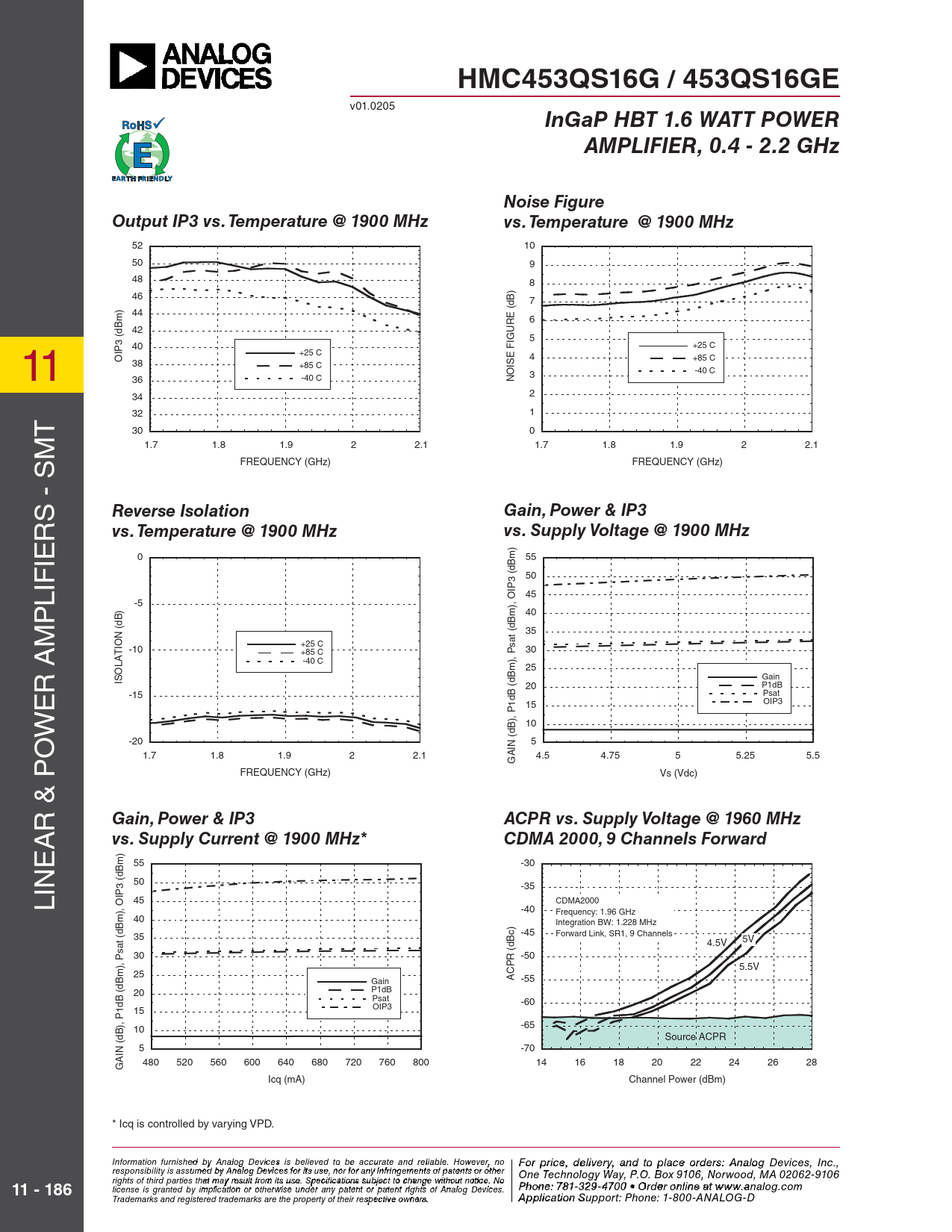 HMC453QS16G / 453QS16GE v01.0205 InGaP HBT 1.6 WATT POWERAMPLIFIER, 0.4 - 2.2 GHzNoise FigureOutput IP3 vs. Temperature @ 1900 MHzvs. Temperature @ 1900 MHz 52 10 50 9 48 8 46 7 44 6 42 GURE (dB) 5 11 40 +25 C +25 C OIP3 (dBm) 4 +85 C 38 SE FI +85 C 3 -40 C 36 -40 C NOI 34 2 T 32 1 30 0 1.7 1.8 1.9 2 2.1 1.7 1.8 1.9 2 2.1 FREQUENCY (GHz) FREQUENCY (GHz) - SM S Reverse IsolationGain, Power & IP3vs. Temperature @ 1900 MHzvs. Supply Voltage @ 1900 MHz 0 55 50 45 PLIFIER -5 40 M 35 +25 C -10 +85 C Psat (dBm), OIP3 (dBm) 30 -40 C 25 ISOLATION (dB) Gain ER A 20 P1dB -15 Psat 15 OIP3 W 10 O -20 5 1.7 1.8 1.9 2 2.1 4.5 4.75 5 5.25 5.5 GAIN (dB), P1dB (dBm), FREQUENCY (GHz) Vs (Vdc) & P R Gain, Power & IP3ACPR vs. Supply Voltage @ 1960 MHz A vs. Supply Current @ 1900 MHz*CDMA 2000, 9 Channels Forward E 55 -30 50 LIN -35 45 CDMA2000 -40 Frequency: 1.96 GHz 40 Integration BW: 1.228 MHz -45 35 Forward Link, SR1, 9 Channels 4.5V 5V Psat (dBm), OIP3 (dBm) 30 -50 5.5V 25 ACPR (dBc) Gain -55 20 P1dB Psat -60 OIP3 15 -65 10 Source ACPR 5 -70 480 520 560 600 640 680 720 760 800 14 16 18 20 22 24 26 28 GAIN (dB), P1dB (dBm), Icq (mA) Channel Power (dBm) * Icq is controlled by varying VPD. Information furnish F e o d r pri by An ce, de alog Devic leis vie s rbyeli, a eve nd to pla d to be accur ce o ate an r d der relia s ble , pl . Ho ease co wever, no For price, delivery, and to place orders: Analog Devices, Inc., responsibility is assumed by Analog Devices for its use, nor for any infringements of patents or other ntact Hittite Microwave Corporation: One Technology Way, P.O. Box 9106, Norwood, MA 02062-9106 20 Alpha Road, Chelmsford, MA 01824 Phone rights of third parties that may result from its use. Specifications subject to change without notice. No license is granted by implication or otherwise under any patent or patent rights of Analog Devices. : 978 Phon -e25 : 7 0 81 -3 3 3 29 4 - 3 F 470 ax 0 • O : 978 rder o - nl 25 in 0 e a - t 33 ww 73 11 - 186 w.analog.com Order On- Trademarks and registered trademarks are the property of their respective owners. line at www.hi A tptipte.co licatio m n Support: Phone: 1-800-ANALOG-D