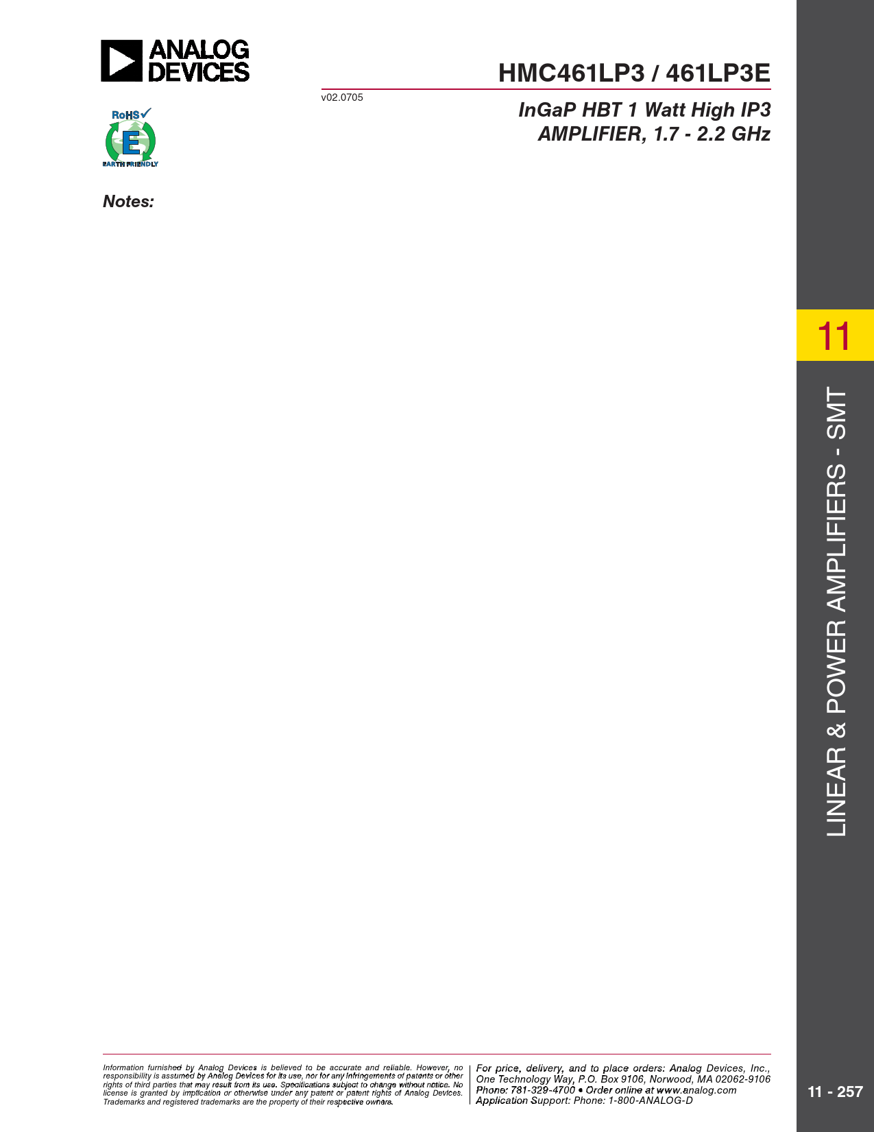 HMC461LP3 / 461LP3E v02.0705 InGaP HBT 1 Watt High IP3AMPLIFIER, 1.7 - 2.2 GHzNotes: 11 T - SM S R IE IF L P M R A E W O & P R A E IN L Information furnish F e o d r pri by An ce, de alog Devic leis vie s rby eli, a eve nd to pla d to be accur ce o ate an r d der relia s ble , pl . Ho ease co wever, no For price, delivery, and to place orders: Analog Devices, Inc., responsibility is assumed by Analog Devices for its use, nor for any infringements of patents or other ntact Hittite Microwave Corporation: One Technology Way, P.O. Box 9106, Norwood, MA 02062-9106 20 Alpha Road, Chelmsford, MA 01824 Phone rights of third parties that may result from its use. Specifications subject to change without notice. No : 978 Pho - n 25 e: 7 0- 81 3 3 3 2 4 9- 3 F 470 ax: 978 0 • Order o - n 25 lin 0 e a-t 3373 license is granted by implication or otherwise under any patent or patent rights of Analog Devices. www.analog.com 11 - 257 Order On- Trademarks and registered trademarks are the property of their respective owners. line at www.hi A tptipte.co licatio m n Support: Phone: 1-800-ANALOG-D