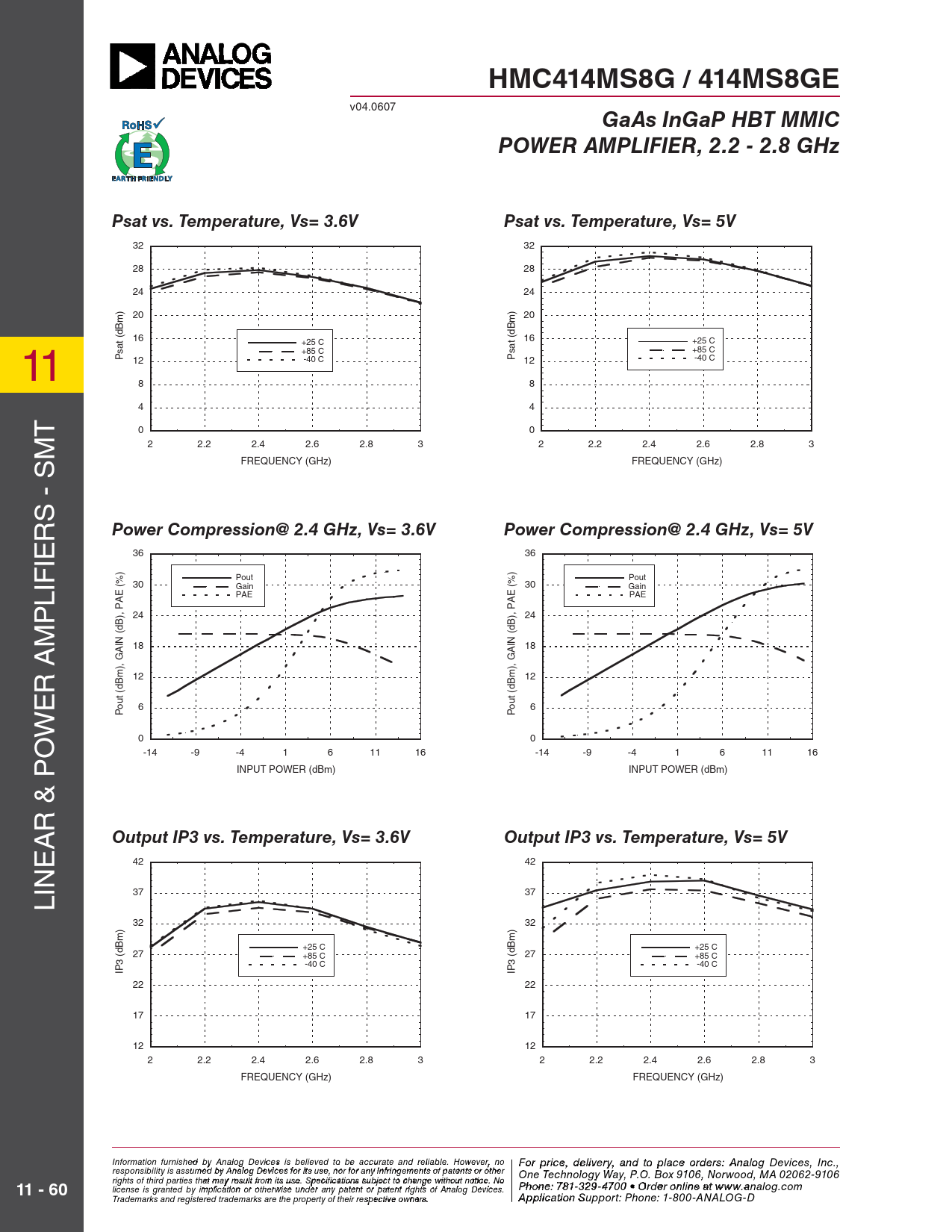 32 32 28 28 24 24 20 20 16 16 11 +25 C +25 C +85 C +85 C Psat (dBm) 12 -40 C Psat (dBm) 12 -40 C 8 8 4 4 T 0 0 2 2.2 2.4 2.6 2.8 3 2 2.2 2.4 2.6 2.8 3 FREQUENCY (GHz) FREQUENCY (GHz) - SM S