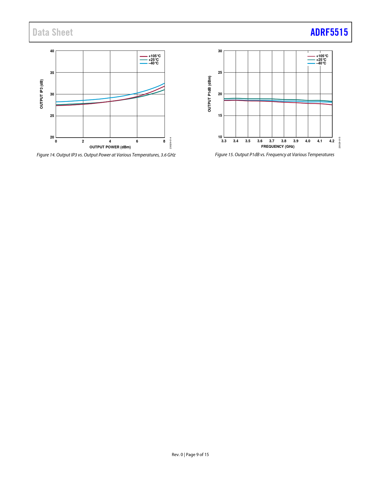 Data SheetADRF55154030+105°C+105°C+25°C+25°C–40°C–40°C3525)Bm)dBd( 3B ( 1dT IP3020UPTPUT POUUT O2515201002468 014 3.33.43.53.63.73.83.94.04.14.2 015 OUTPUT POWER (dBm)FREQUENCY (GHz) 23029- 23029- Figure 14. Output IP3 vs. Output Power at Various Temperatures, 3.6 GHz Figure 15. Output P1dB vs. Frequency at Various Temperatures Rev. 0 | Page 9 of 15 Document Outline FEATURES APPLICATIONS GENERAL DESCRIPTION FUNCTIONAL BLOCK DIAGRAM TABLE OF CONTENTS REVISION HISTORY SPECIFICATIONS ELECTRICAL SPECIFICATIONS ABSOLUTE MAXIMUM RATINGS THERMAL RESISTANCE ELECTROSTATIC DISCHARGE (ESD) RATINGS ESD Ratings for ADRF5515 ESD CAUTION PIN CONFIGURATION AND FUNCTION DESCRIPTIONS INTERFACE SCHEMATICS TYPICAL PERFORMANCE CHARACTERISTICS RECEIVE OPERATION, HIGH GAIN MODE RECEIVE OPERATION, LOW GAIN MODE TRANSMIT OPERATION THEORY OF OPERATION SIGNAL PATH SELECT Transmit Operation Receive Operation BIASING SEQUENCE APPLICATIONS INFORMATION OUTLINE DIMENSIONS ORDERING GUIDE