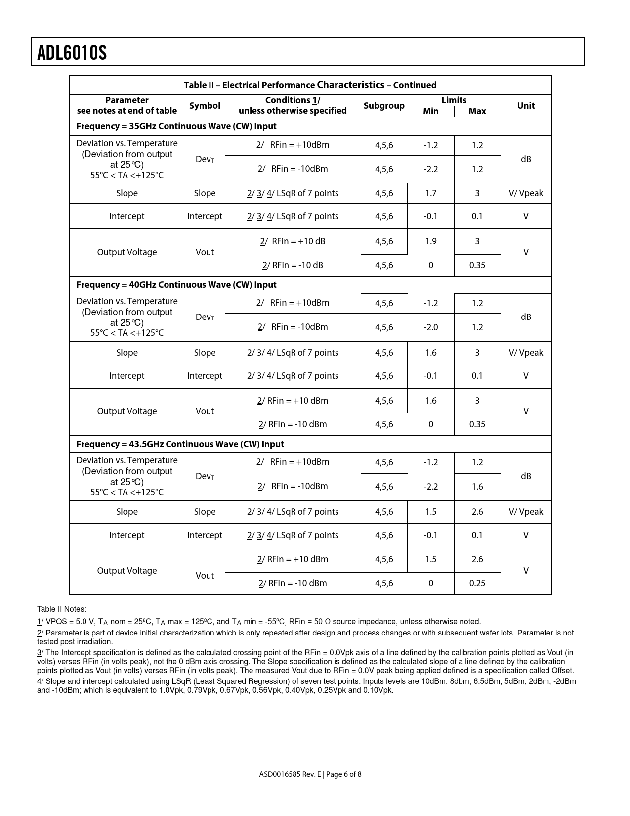 ADL6010S Table II – Electrical Performance Characteristics – Continued Parameter Conditions 1/ Limits
