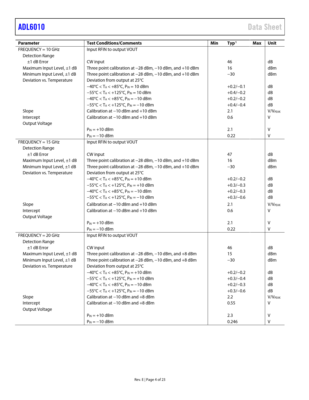 页数 / 页23 / 4 — ADL6010. Data Sheet. Parameter. Test Conditions/Comments. Min. Typ1. Max. …