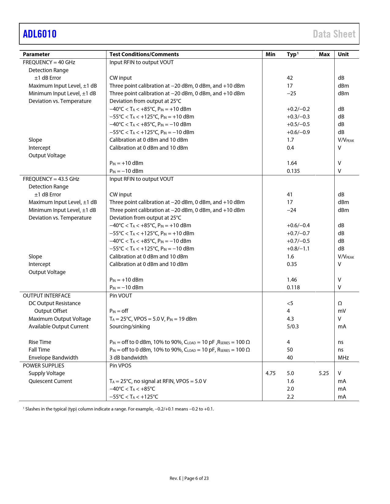 页数 / 页23 / 6 — ADL6010. Data Sheet. Parameter. Test Conditions/Comments. Min. Typ1. Max. …