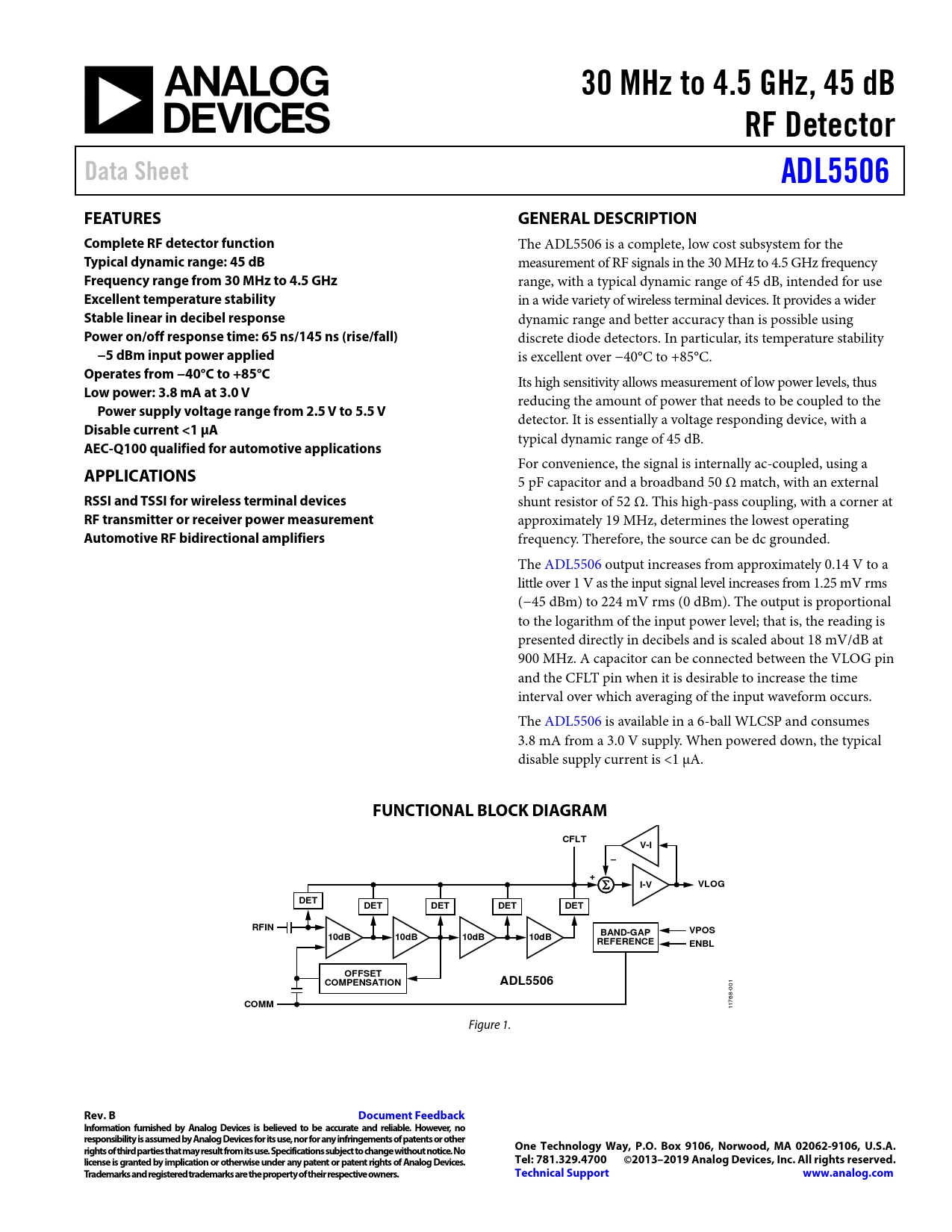 30 MHz to 4.5 GHz, 45 dB. RF Detector. Data Sheet. ADL5506. FEATURES. GENERAL DESCRIPTION. Complete RF detector function