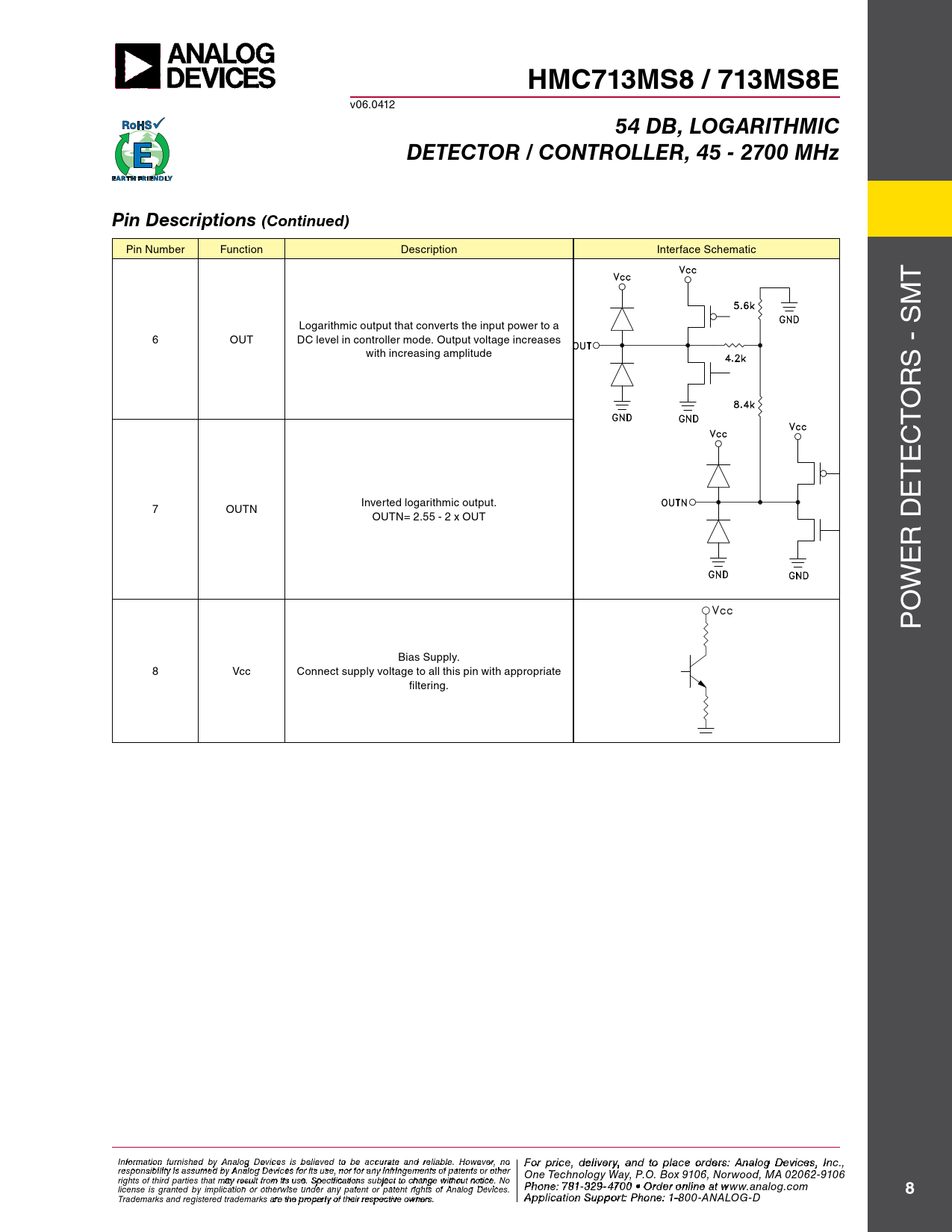 HMC713MS8 / 713MS8E. 54 DB, LOGARITHMIC. DETECTOR / CONTROLLER, 45 - 2700 MHz. Pin Descriptions (Continued)