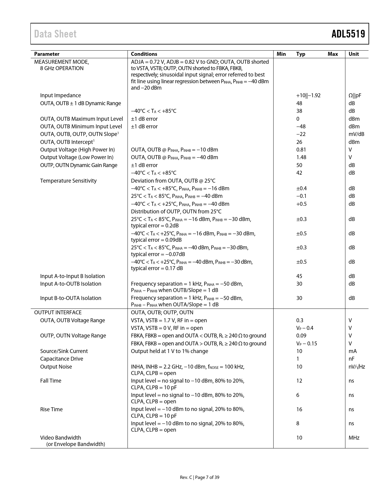link to page 8 link to page 8 Data SheetADL5519ParameterConditionsMinTypMaxUnit MEASUREMENT MODE, ADJA = 0.72 V, ADJB = 0.82 V to GND; OUTA, OUTB shorted 8 GHz OPERATION to VSTA, VSTB; OUTP, OUTN shorted to FBKA, FBKB, respectively; sinusoidal input signal; error referred to best fit line using linear regression between PINHA, PINHB = −40 dBm and −20 dBm Input Impedance +10||−1.92 Ω||pF OUTA, OUTB ± 1 dB Dynamic Range 48 dB −40°C < TA < +85°C 38 dB OUTA, OUTB Maximum Input Level ±1 dB error 0 dBm OUTA, OUTB Minimum Input Level ±1 dB error −48 dBm OUTA, OUTB, OUTP, OUTN Slope1 −22 mV/dB OUTA, OUTB Intercept1 26 dBm Output Voltage (High Power In) OUTA, OUTB @ PINHA, PINHB = −10 dBm 0.81 V Output Voltage (Low Power In) OUTA, OUTB @ PINHA, PINHB = −40 dBm 1.48 V OUTP, OUTN Dynamic Gain Range ±1 dB error 50 dB −40°C < TA < +85°C 42 dB Temperature Sensitivity Deviation from OUTA, OUTB @ 25°C −40°C < TA < +85°C, PINHA, PINHB = −16 dBm ±0.4 dB 25°C < TA < 85°C, PINHA, PINHB = −40 dBm −0.1 dB −40°C < TA < +25°C, PINHA, PINHB = −40 dBm +0.5 dB Distribution of OUTP, OUTN from 25°C 25°C < TA < 85°C, PINHA = −16 dBm, PINHB = −30 dBm, ±0.3 dB typical error = 0.2dB −40°C < TA < +25°C, PINHA = −16 dBm, PINHB = −30 dBm, ±0.5 dB typical error = 0.09dB 25°C < TA < 85°C, PINHA = −40 dBm, PINHB = −30 dBm, ±0.3 dB typical error = −0.07dB −40°C < TA < +25°C, PINHA = −40 dBm, PINHB = −30 dBm, ±0.5 dB typical error = 0.17 dB Input A-to-Input B Isolation 45 dB Input A-to-OUTB Isolation Frequency separation = 1 kHz, PINHA = −50 dBm, 30 dB PINHA – PINHB when OUTB/Slope = 1 dB Input B-to-OUTA Isolation Frequency separation = 1 kHz, PINHB = −50 dBm, 30 dB PINHB – PINHA when OUTA/Slope = 1 dB OUTPUT INTERFACE OUTA, OUTB; OUTP, OUTN OUTA, OUTB Voltage Range VSTA, VSTB = 1.7 V, RF in = open 0.3 V VSTA, VSTB = 0 V, RF in = open VP − 0.4 V OUTP, OUTN Voltage Range FBKA, FBKB = open and OUTA < OUTB, RL ≥ 240 Ω to ground 0.09 V FBKA, FBKB = open and OUTA > OUTB, RL ≥ 240 Ω to ground VP − 0.15 V Source/Sink Current Output held at 1 V to 1% change 10 mA Capacitance Drive 1 nF Output Noise INHA, INHB = 2.2 GHz, −10 dBm, fNOISE = 100 kHz, 10 nV/√Hz CLPA, CLPB = open Fall Time Input level = no signal to −10 dBm, 80% to 20%, 12 ns CLPA, CLPB = 10 pF Input level = no signal to −10 dBm, 80% to 20%, 6 ns CLPA, CLPB = open Rise Time Input level = −10 dBm to no signal, 20% to 80%, 16 ns CLPA, CLPB = 10 pF Input level = −10 dBm to no signal, 20% to 80%, 8 ns CLPA, CLPB = open Video Bandwidth 10 MHz (or Envelope Bandwidth) Rev. C | Page 7 of 39 Document Outline FEATURES APPLICATIONS FUNCTIONAL BLOCK DIAGRAM GENERAL DESCRIPTION TABLE OF CONTENTS REVISION HISTORY SPECIFICATIONS ABSOLUTE MAXIMUM RATINGS ESD CAUTION PIN CONFIGURATION AND FUNCTION DESCRIPTIONS TYPICAL PERFORMANCE CHARACTERISTICS THEORY OF OPERATION USING THE ADL5519 BASIC CONNECTIONS INPUT SIGNAL COUPLING TEMPERATURE SENSOR INTERFACE VREF INTERFACE POWER-DOWN INTERFACE SETPOINT INTERFACE—VSTA, VSTB OUTPUT INTERFACE—OUTA, OUTB DIFFERENCE OUTPUT—OUTP, OUTN DESCRIPTION OF CHARACTERIZATION BASIS FOR ERROR CALCULATIONS DEVICE CALIBRATION ADJUSTING ACCURACY THROUGH CHOICE OF CALIBRATION POINTS TEMPERATURE COMPENSATION ADJUSTMENT ALTERING THE SLOPE CHANNEL ISOLATION OUTPUT FILTERING PACKAGE CONSIDERATIONS OPERATION ABOVE 8 GHz APPLICATIONS INFORMATION MEASUREMENT MODE CONTROLLER MODE AUTOMATIC GAIN CONTROL GAIN-STABLE TRANSMITTER/RECEIVER MEASURING VSWR EVALUATION BOARD CONFIGURATION OPTIONS EVALUATION BOARD SCHEMATIC AND ARTWORK OUTLINE DIMENSIONS ORDERING GUIDE