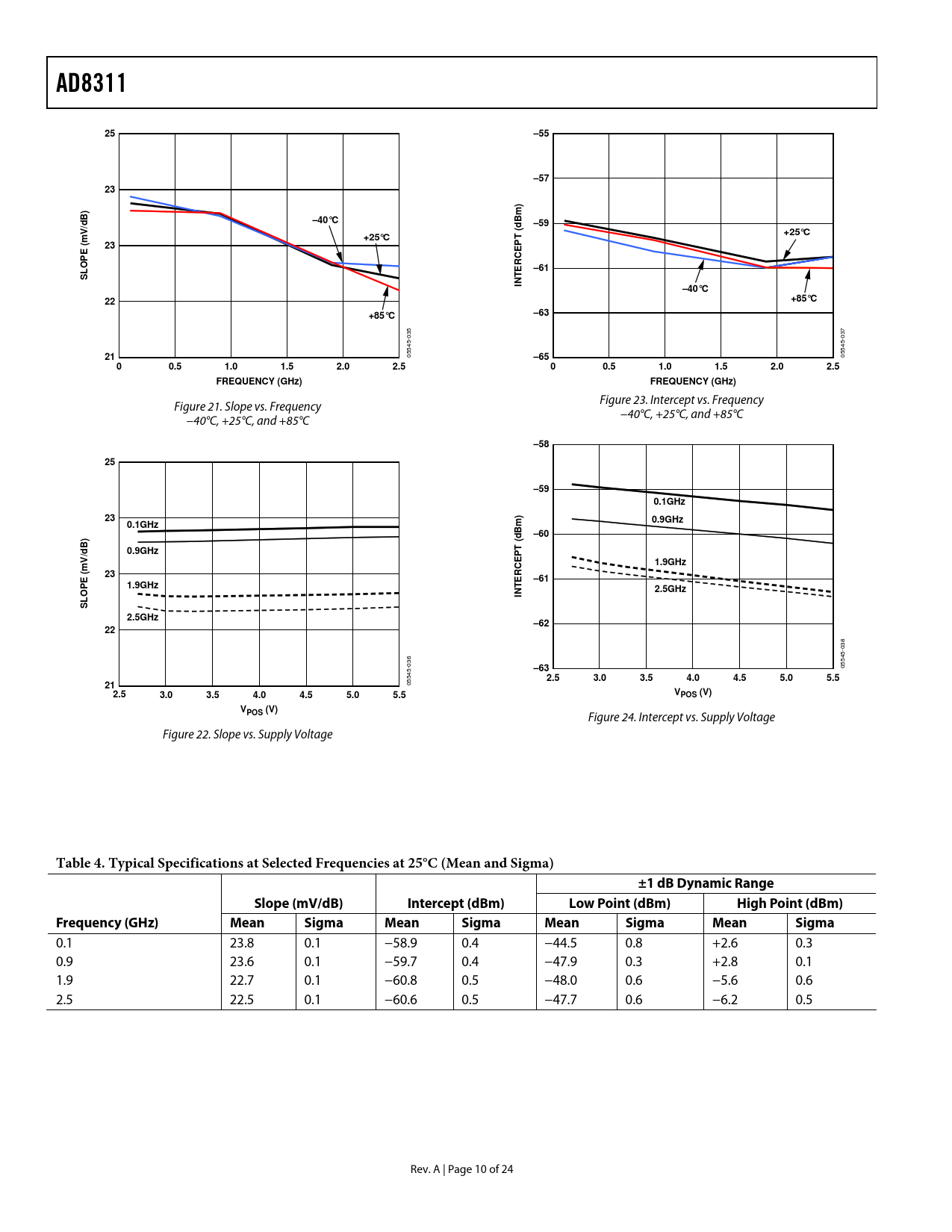 AD831125–55–5723)–40°C–59V/dB+25°Cm+25°CT (dBm)23PRCE–61SLOPE (INTE–40°C22+85°C+85°C–6321 05545-035 –65 05545-037 00.51.01.52.02.500.51.01.52.02.5FREQUENCY (GHz)FREQUENCY (GHz) Figure 23. Intercept vs. Frequency Figure 21. Slope vs. Frequency −40°C, +25°C, and +85°C −40°C, +25°C, and +85°C –5825–590.1GHz230.9GHz0.1GHz–60)0.9GHzT (dBm) PV/dB1.9GHzm23RCE–611.9GHz2.5GHzINTESLOPE (2.5GHz–6222–63 05545-038 2.53.03.54.04.55.05.521 05545-036 2.53.03.54.04.55.05.5VPOS (V)VPOS (V) Figure 24. Intercept vs. Supply Voltage Figure 22. Slope vs. Supply Voltage Table 4. Typical Specifications at Selected Frequencies at 25°C (Mean and Sigma)±1 dB Dynamic RangeSlope (mV/dB)Intercept (dBm)Low Point (dBm)High Point (dBm)Frequency (GHz)MeanSigmaMeanSigmaMeanSigmaMeanSigma 0.1 23.8 0.1 −58.9 0.4 −44.5 0.8 +2.6 0.3 0.9 23.6 0.1 −59.7 0.4 −47.9 0.3 +2.8 0.1 1.9 22.7 0.1 −60.8 0.5 −48.0 0.6 −5.6 0.6 2.5 22.5 0.1 −60.6 0.5 −47.7 0.6 −6.2 0.5 Rev. A | Page 10 of 24 Document Outline FEATURES APPLICATIONS GENERAL DESCRIPTION FUNCTIONAL BLOCK DIAGRAM SPECIFICATIONS ABSOLUTE MAXIMUM RATINGS ESD CAUTION PIN CONFIGURATION AND FUNCTION DESCRIPTIONS TYPICAL PERFORMANCE CHARACTERISTICS THEORY OF OPERATION BASIC THEORY CONTROLLER-MODE LOG AMPS CONTROL LOOP DYNAMICS BASIC CONNECTIONS RANGE ON VSET AND RFIN TRANSIENT RESPONSE MOBILE HANDSET POWER CONTROL EXAMPLE POWER-ON AND POWER-OFF INPUT COUPLING OPTIONS TEMPERATURE DRIFT DEVICE CALIBRATION AND ERROR CALCULATION SELECTING CALIBRATION POINTS TO IMPROVE ACCURACY OVER A REDUCED RANGE DEVICE HANDLING EVALUATION BOARD OUTLINE DIMENSIONS ORDERING GUIDE