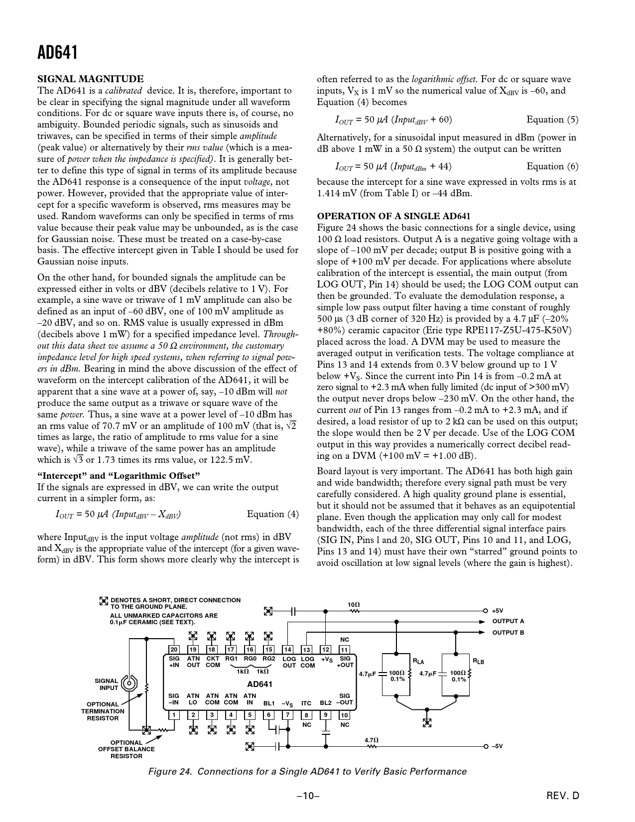 link to page 9 link to page 10 link to page 10 AD641SIGNAL MAGNITUDE often referred to as the logarithmic offset. For dc or square wave The AD641 is a calibrated device. It is, therefore, important to inputs, VX is 1 mV so the numerical value of XdBV is –60, and be clear in specifying the signal magnitude under all waveform Equation (4) becomes conditions. For dc or square wave inputs there is, of course, no I ambiguity. Bounded periodic signals, such as sinusoids and OUT = 50 µA (InputdBV + 60) Equation (5) triwaves, can be specified in terms of their simple amplitude Alternatively, for a sinusoidal input measured in dBm (power in (peak value) or alternatively by their rms value (which is a mea- dB above 1 mW in a 50 Ω system) the output can be written sure of power when the impedance is specified). It is generally bet- ter to define this type of signal in terms of its amplitude because IOUT = 50 µA (InputdBm + 44) Equation (6) the AD641 response is a consequence of the input voltage, not because the intercept for a sine wave expressed in volts rms is at power. However, provided that the appropriate value of inter- 1.414 mV (from Table I) or –44 dBm. cept for a specific waveform is observed, rms measures may be used. Random waveforms can only be specified in terms of rms OPERATION OF A SINGLE AD641 value because their peak value may be unbounded, as is the case Figure 24 shows the basic connections for a single device, using for Gaussian noise. These must be treated on a case-by-case 100 Ω load resistors. Output A is a negative going voltage with a basis. The effective intercept given in Table I should be used for slope of –100 mV per decade; output B is positive going with a Gaussian noise inputs. slope of +100 mV per decade. For applications where absolute On the other hand, for bounded signals the amplitude can be calibration of the intercept is essential, the main output (from expressed either in volts or dBV (decibels relative to 1 V). For LOG OUT, Pin 14) should be used; the LOG COM output can example, a sine wave or triwave of 1 mV amplitude can also be then be grounded. To evaluate the demodulation response, a defined as an input of –60 dBV, one of 100 mV amplitude as simple low pass output filter having a time constant of roughly –20 dBV, and so on. RMS value is usually expressed in dBm 500 µs (3 dB corner of 320 Hz) is provided by a 4.7 µF (–20% (decibels above 1 mW) for a specified impedance level. Through- +80%) ceramic capacitor (Erie type RPE117-Z5U-475-K50V) out this data sheet we assume a 50 Ω environment, the customary placed across the load. A DVM may be used to measure the impedance level for high speed systems, when referring to signal pow- averaged output in verification tests. The voltage compliance at ers in dBm. Bearing in mind the above discussion of the effect of Pins 13 and 14 extends from 0.3 V below ground up to 1 V waveform on the intercept calibration of the AD641, it will be below +VS. Since the current into Pin 14 is from –0.2 mA at apparent that a sine wave at a power of, say, –10 dBm will not zero signal to +2.3 mA when fully limited (dc input of >300 mV) produce the same output as a triwave or square wave of the the output never drops below –230 mV. On the other hand, the same power. Thus, a sine wave at a power level of –10 dBm has current out of Pin 13 ranges from –0.2 mA to +2.3 mA, and if an rms value of 70.7 mV or an amplitude of 100 mV (that is, √2 desired, a load resistor of up to 2 kΩ can be used on this output; times as large, the ratio of amplitude to rms value for a sine the slope would then be 2 V per decade. Use of the LOG COM wave), while a triwave of the same power has an amplitude output in this way provides a numerically correct decibel read- which is √3 or 1.73 times its rms value, or 122.5 mV. ing on a DVM (+100 mV = +1.00 dB). Board layout is very important. The AD641 has both high gain “Intercept” and “Logarithmic Offset” If the signals are expressed in dBV, we can write the output and wide bandwidth; therefore every signal path must be very current in a simpler form, as: carefully considered. A high quality ground plane is essential, but it should not be assumed that it behaves as an equipotential IOUT = 50 µA (InputdBV – XdBV) Equation (4) plane. Even though the application may only call for modest bandwidth, each of the three differential signal interface pairs where InputdBV is the input voltage amplitude (not rms) in dBV (SIG IN, Pins l and 20, SIG OUT, Pins 10 and 11, and LOG, and XdBV is the appropriate value of the intercept (for a given wave- Pins 13 and 14) must have their own “starred” ground points to form) in dBV. This form shows more clearly why the intercept is avoid oscillation at low signal levels (where the gain is highest). DENOTES A SHORT, DIRECT CONNECTION10TO THE GROUND PLANE. V +5VALL UNMARKED CAPACITORS ARE 0.1OUTPUT A m F CERAMIC (SEE TEXT).OUTPUT BNC20191817161514131211SIGATNCKTRG1RG0RG2LOG LOG+VSIGSRLAR+INOUT COMLBOUT COM+OUT1k V 1k V 4.7 m F100 V 4.7 m F100 V 0.1%SIGNAL0.1%AD641INPUTSIGATNATNATNATNSIG–INLOCOM COMINOPTIONALBL1–VBL2 –OUTSITCTERMINATION12345678910RESISTORNCNC4.7 V OPTIONAL–5VOFFSET BALANCERESISTOR Figure 24. Connections for a Single AD641 to Verify Basic Performance –10– REV. D Document Outline FEATURES PRODUCT DESCRIPTION PIN CONFIGURATIONS AD641--SPECIFICATIONS ELECTRICAL CHARACTERISTICS THERMAL CHARACTERISTICS ABSOLUTE MAXIMUM RATINGS ESD CAUTION REVISION HISTORY AD641--TYPICAL DC PERFORMANCE CHARACTERISTICS TYPICAL AC PERFORMANCE CHARACTERISTICS CIRCUIT DESCRIPTION CIRCUIT OPERATION FUNDAMENTALS OF LOGARITHMIC CONVERSION INTERCEPT STABILIZATION CONVERSION RANGE EFFECT OF WAVEFORM ON INTERCEPT LOGARITHMIC CONFORMANCE AND WAVEFORM SIGNAL MAGNITUDE INTERCEPT AND LOGARITHMIC OFFSET OPERATION OF A SINGLE AD641 ACTIVE CURENT-TO-VOLTAGE CONVERSION EFFECT OF FREQUENCY ON CALIBRATION SOURCE RESISTANCE AND INPUT OFFSET USING HIGHER SUP