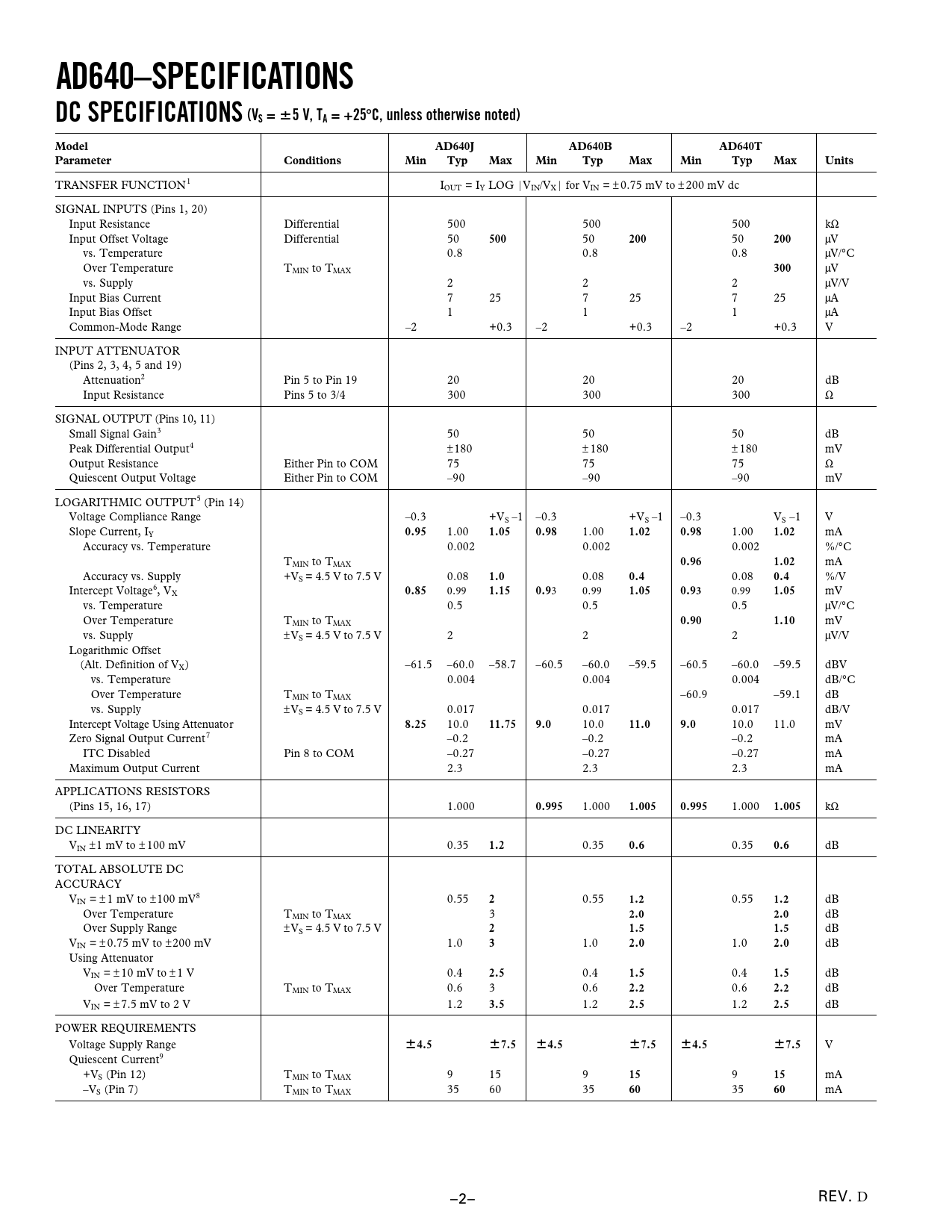 AD640–SPECIFICATIONS. DC SPECIFICATIONS (VS =. 5 V, TA = +25. C, unless otherwise noted). Model. AD640J. AD640B. AD640T. Parameter
