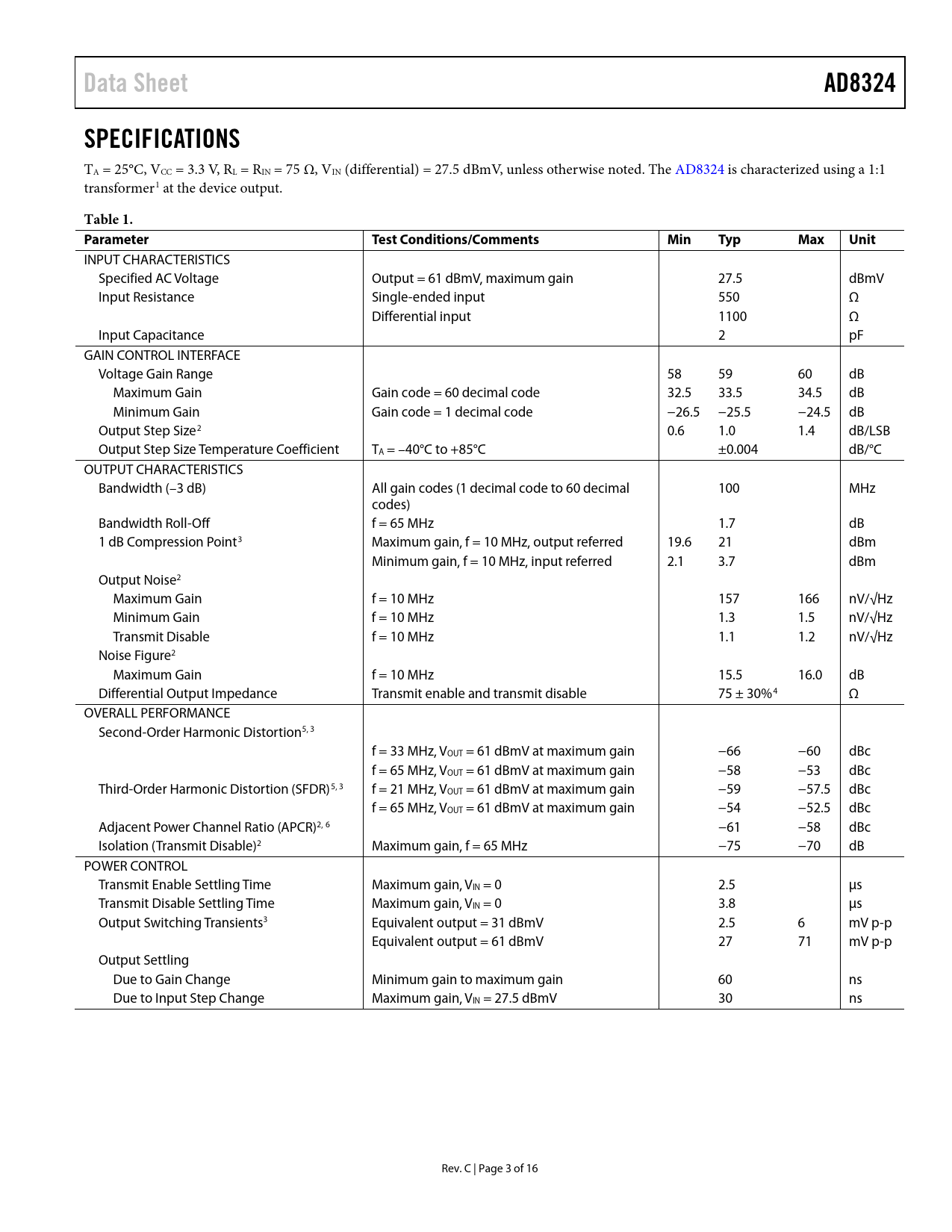 Data Sheet AD8324 SPECIFICATIONS Table 1 Parameter Test Conditions/Comments Min Typ Max Unit