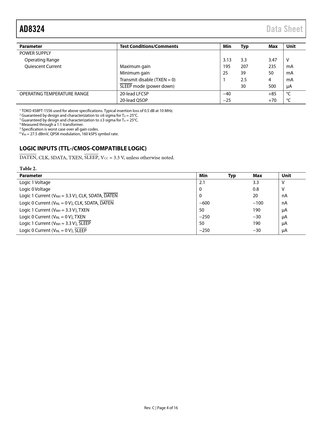AD8324Data SheetParameterTest Conditions/CommentsMinTypMaxUnit POWER SUPPLY Operating Range 3.13 3.3 3.47 V Quiescent Current Maximum gain 195 207 235 mA Minimum gain 25 39 50 mA Transmit disable (TXEN = 0) 1 2.5 4 mA SLEEP mode (power down) 30 500 µA OPERATING TEMPERATURE RANGE 20-lead LFCSP −40 +85 °C 20-lead QSOP −25 +70 °C 1 TOKO 458PT-1556 used for above specifications. Typical insertion loss of 0.5 dB at 10 MHz. 2 Guaranteed by design and characterization to ±6 sigma for TA = 25°C. 3 Guaranteed by design and characterization to ±3 sigma for TA = 25°C. 4 Measured through a 1:1 transformer. 5 Specification is worst case over all gain codes. 6 VIN = 27.5 dBmV, QPSK modulation, 160 kSPS symbol rate. LOGIC INPUTS (TTL-/CMOS-COMPATIBLE LOGIC) DATEN, CLK, SDATA, TXEN, SLEEP, VCC = 3.3 V, unless otherwise noted. Table 2. ParameterMinTypMaxUnit Logic 1 Voltage 2.1 3.3 V Logic 0 Voltage 0 0.8 V Logic 1 Current (VINH = 3.3 V), CLK, SDATA, DATEN 0 20 nA Logic 0 Current (VINL = 0 V), CLK, SDATA, DATEN −600 −100 nA Logic 1 Current (VINH = 3.3 V), TXEN 50 190 µA Logic 0 Current (VINL = 0 V), TXEN −250 −30 µA Logic 1 Current (VINH = 3.3 V), SLEEP 50 190 µA Logic 0 Current (VINL = 0 V), SLEEP −250 −30 µA Rev. C | Page 4 of 16 Document Outline FEATURES APPLICATIONS FUNCTIONAL BLOCK DIAGRAM GENERAL DESCRIPTION TABLE OF CONTENTS REVISION HISTORY SPECIFICATIONS LOGIC INPUTS (TTL-/CMOS-COMPATIBLE LOGIC) TIMING REQUIREMENTS Timing Diagrams ABSOLUTE MAXIMUM RATINGS THERMAL RESISTANCE ESD CAUTION PIN CONFIGURATION AND FUNCTION DESCRIPTIONS TYPICAL PERFORMANCE CHARACTERISTICS TEST CIRCUIT APPLICATIONS INFORMATION GENERAL APPLICATIONS CIRCUIT DESCRIPTION GAIN PROGRAMMING FOR THE AD8324 INPUT BIAS, IMPEDANCE, AND TERMINATION OUTPUT BIAS, IMPEDANCE, AND TERMINATION POWER SUPPLY SIGNAL INTEGRITY LAYOUT CONSIDERATIONS INITIAL POWER-UP RAMP PIN AND BYP PIN FEATURES POWER SAVING FEATURES DISTORTION, ADJACENT CHANNEL POWER, AND DOCSIS UTILIZING DIPLEX FILTERS NOISE AND DOCSIS DIFFERENTIAL SIGNAL SOURCE DIFFERENTIAL SIGNAL FROM SINGLE-ENDED SOURCE SINGLE-ENDED SOURCE OUTLINE DIMENSIONS ORDERING GUIDE