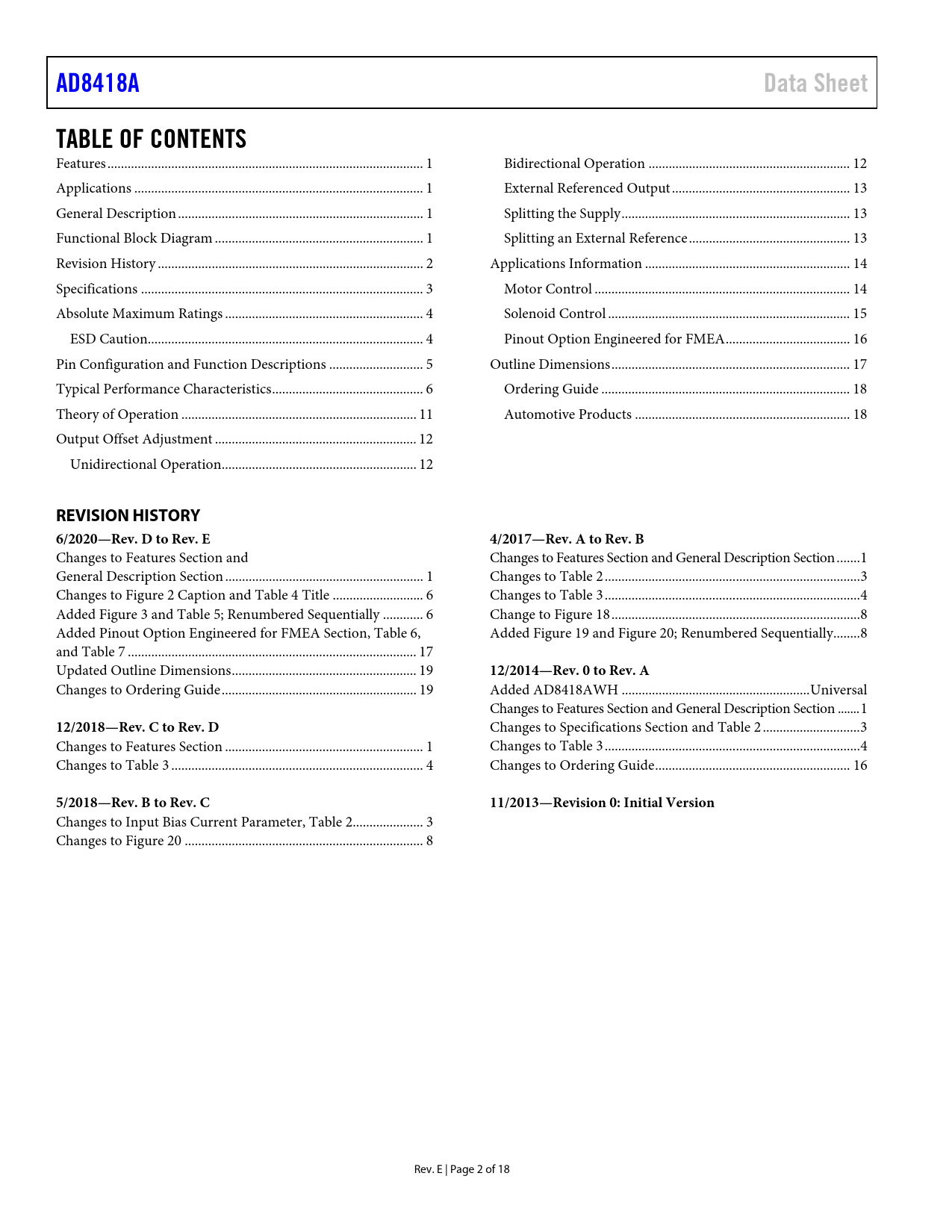 link to page 1 link to page 1 link to page 1 link to page 1 link to page 2 link to page 3 link to page 4 link to page 4 link to page 5 link to page 6 link to page 11 link to page 12 link to page 12 link to page 12 link to page 13 link to page 13 link to page 13 link to page 14 link to page 14 link to page 15 link to page 16 link to page 17 link to page 18 link to page 18 AD8418AData SheetTABLE OF CONTENTS Features .. 1 Bidirectional Operation .. 12 Applications .. 1 External Referenced Output ... 13 General Description ... 1 Splitting the Supply .. 13 Functional Block Diagram .. 1 Splitting an External Reference .. 13 Revision History ... 2 Applications Information ... 14 Specifications .. 3 Motor Control .. 14 Absolute Maximum Ratings ... 4 Solenoid Control .. 15 ESD Caution.. 4 Pinout Option Engineered for FMEA ... 16 Pin Configuration and Function Descriptions .. 5 Outline Dimensions ... 17 Typical Performance Characteristics ... 6 Ordering Guide .. 18 Theory of Operation .. 11 Automotive Products .. 18 Output Offset Adjustment .. 12 Unidirectional Operation .. 12 REVISION HISTORY6/2020—Rev. D to Rev. E4/2017—Rev. A to Rev. B Changes to Features Section and Changes to Features Section and General Description Section ... 1 General Description Section ... 1 Changes to Table 2 .. 3 Changes to Figure 2 Caption and Table 4 Title ... 6 Changes to Table 3 .. 4 Added Figure 3 and Table 5; Renumbered Sequentially .. 6 Change to Figure 18 .. 8 Added Pinout Option Engineered for FMEA Section, Table 6, Added Figure 19 and Figure 20; Renumbered Sequentially .. 8 and Table 7 .. 17 Updated Outline Dimensions ... 19 12/2014—Rev. 0 to Rev. A Changes to Ordering Guide .. 19 Added AD8418AWH .. Universal Changes to Features Section and General Description Section ... 1 12/2018—Rev. C to Rev. D Changes to Specifications Section and Table 2 ... 3 Changes to Features Section ... 1 Changes to Table 3 .. 4 Changes to Table 3 ... 4 Changes to Ordering Guide .. 16 5/2018—Rev. B to Rev. C11/2013—Revision 0: Initial Version Changes to Input Bias Current Parameter, Table 2 ... 3 Changes to Figure 20 ... 8 Rev. E | Page 2 of 18 Document Outline FEATURES APPLICATIONS GENERAL DESCRIPTION FUNCTIONAL BLOCK DIAGRAM TABLE OF CONTENTS REVISION HISTORY SPECIFICATIONS ABSOLUTE MAXIMUM RATINGS ESD CAUTION PIN CONFIGURATION AND FUNCTION DESCRIPTIONS TYPICAL PERFORMANCE CHARACTERISTICS THEORY OF OPERATION OUTPUT OFFSET ADJUSTMENT UNIDIRECTIONAL OPERATION Ground Referenced Output Mode VS Referenced Output Mode BIDIRECTIONAL OPERATION EXTERNAL REFERENCED OUTPUT SPLITTING THE SUPPLY SPLITTING AN EXTERNAL REFERENCE APPLICATIONS INFORMATION MOTOR CONTROL 3-Phase Motor Control H-Bridge Motor Control SOLENOID CONTROL High-Side Current Sense with a Low-Side Switch High-Side Current Sense with a High-Side Switch High Rail Current Sensing PINOUT OPTION ENGINEERED FOR FMEA OUTLINE DIMENSIONS ORDERING GUIDE AUTOMOTIVE PRODUCTS