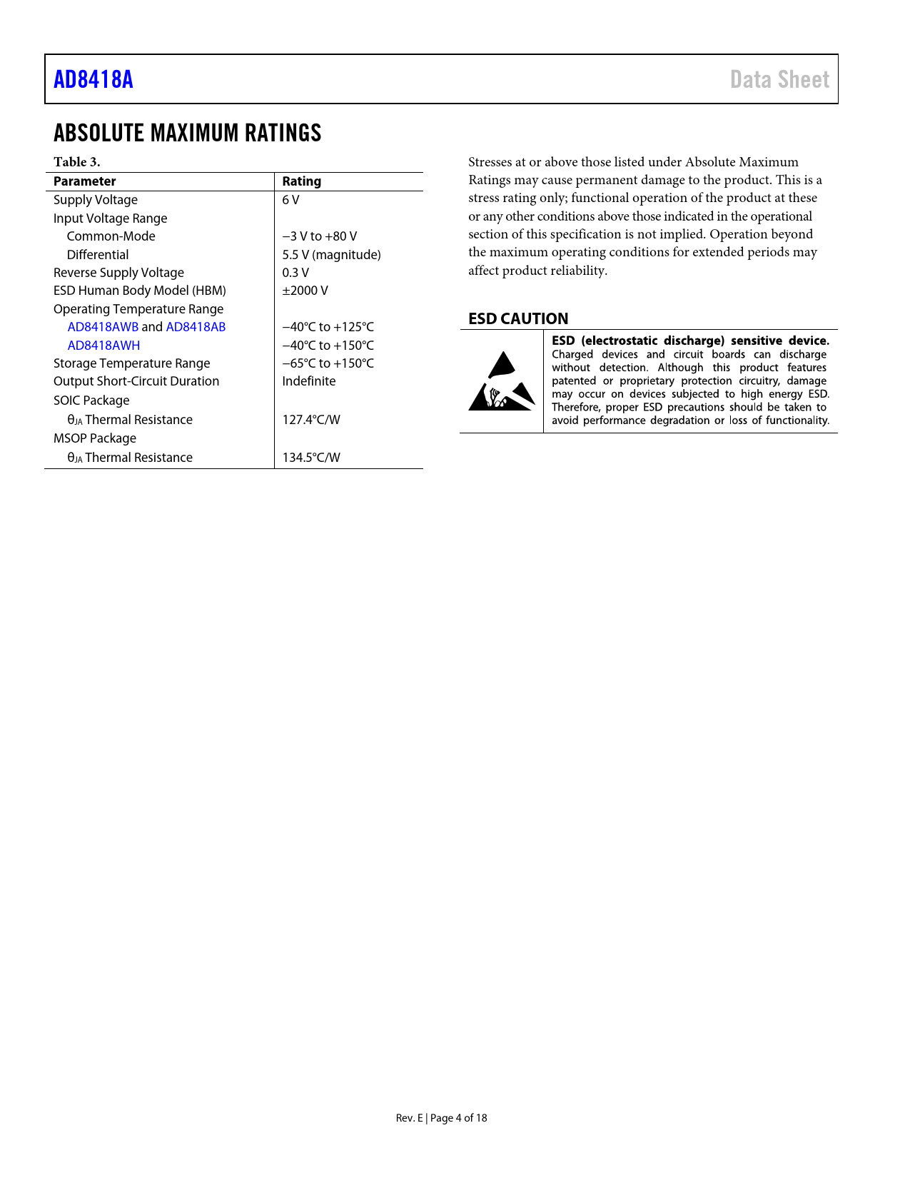 AD8418A. Data Sheet. ABSOLUTE MAXIMUM RATINGS Table 3. Parameter Rating. ESD CAUTION