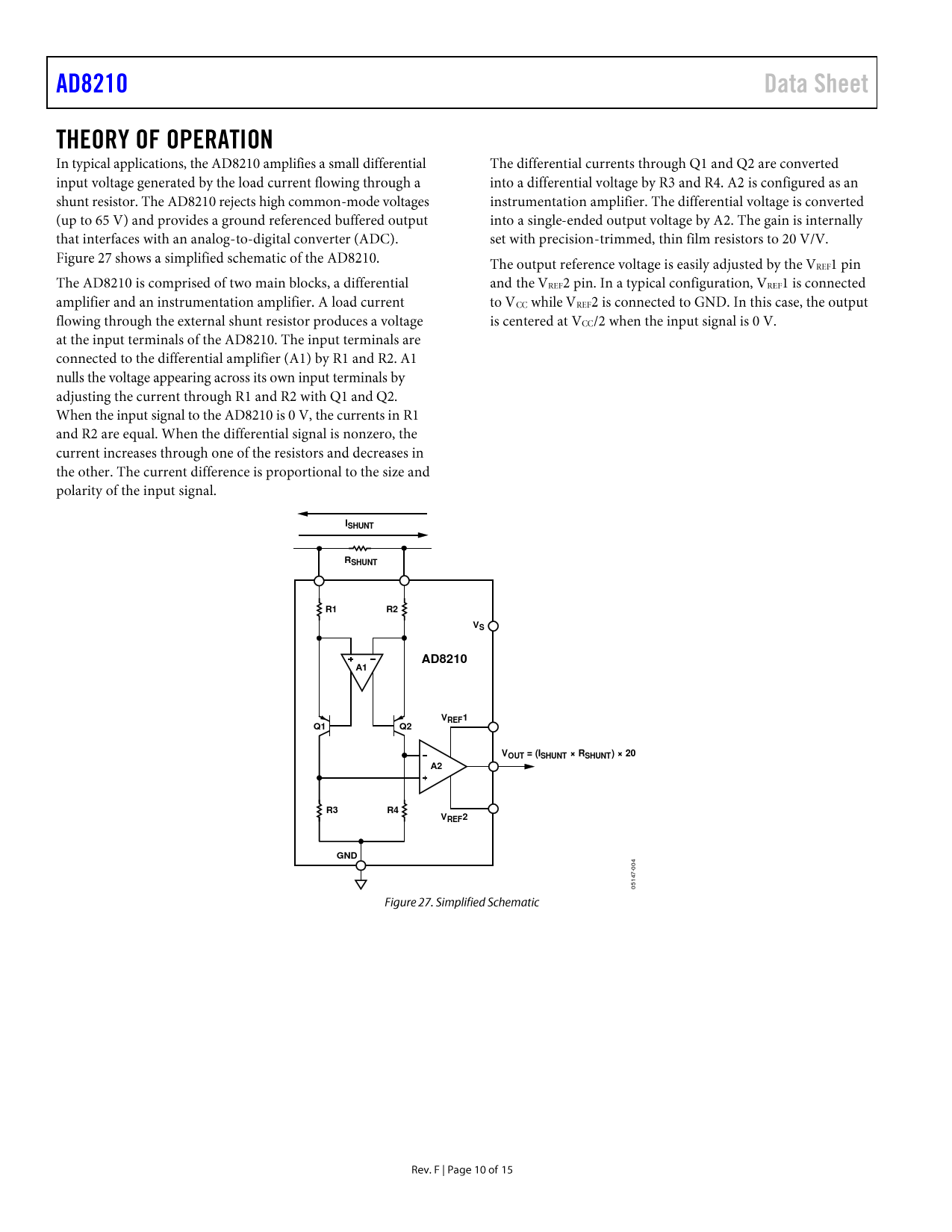 link to page 10 ISHUNTRSHUNTR1R2VSAD8210A1VREF1Q1Q2VOUT = (ISHUNT × RSHUNT) × 20A2R3R4VREF2GND 4 0 -0 7 4 1 5 0 Document Outline FEATURES APPLICATIONS FUNCTIONAL BLOCK DIAGRAM GENERAL DESCRIPTION TABLE OF CONTENTS REVISION HISTORY SPECIFICATIONS ABSOLUTE MAXIMUM RATINGS ESD CAUTION PIN CONFIGURATION AND FUNCTION DESCRIPTIONS TYPICAL PERFORMANCE CHARACTERISTICS THEORY OF OPERATION MODES OF OPERATION UNIDIRECTIONAL OPERATION Ground Referenced Output V+ Referenced Output BIDIRECTIONAL OPERATION External Referenced Output Splitting an External Reference Splitting the Supply INPUT FILTERING APPLICATIONS INFORMATION HIGH-SIDE CURRENT SENSE WITH A LOW-SIDE SWITCH HIGH-SIDE CURRENT SENSE WITH A HIGH-SIDE SWITCH H-BRIDGE MOTOR CONTROL OUTLINE DIMENSIONS ORDERING GUIDE AUTOMOTIVE PRODUCTS