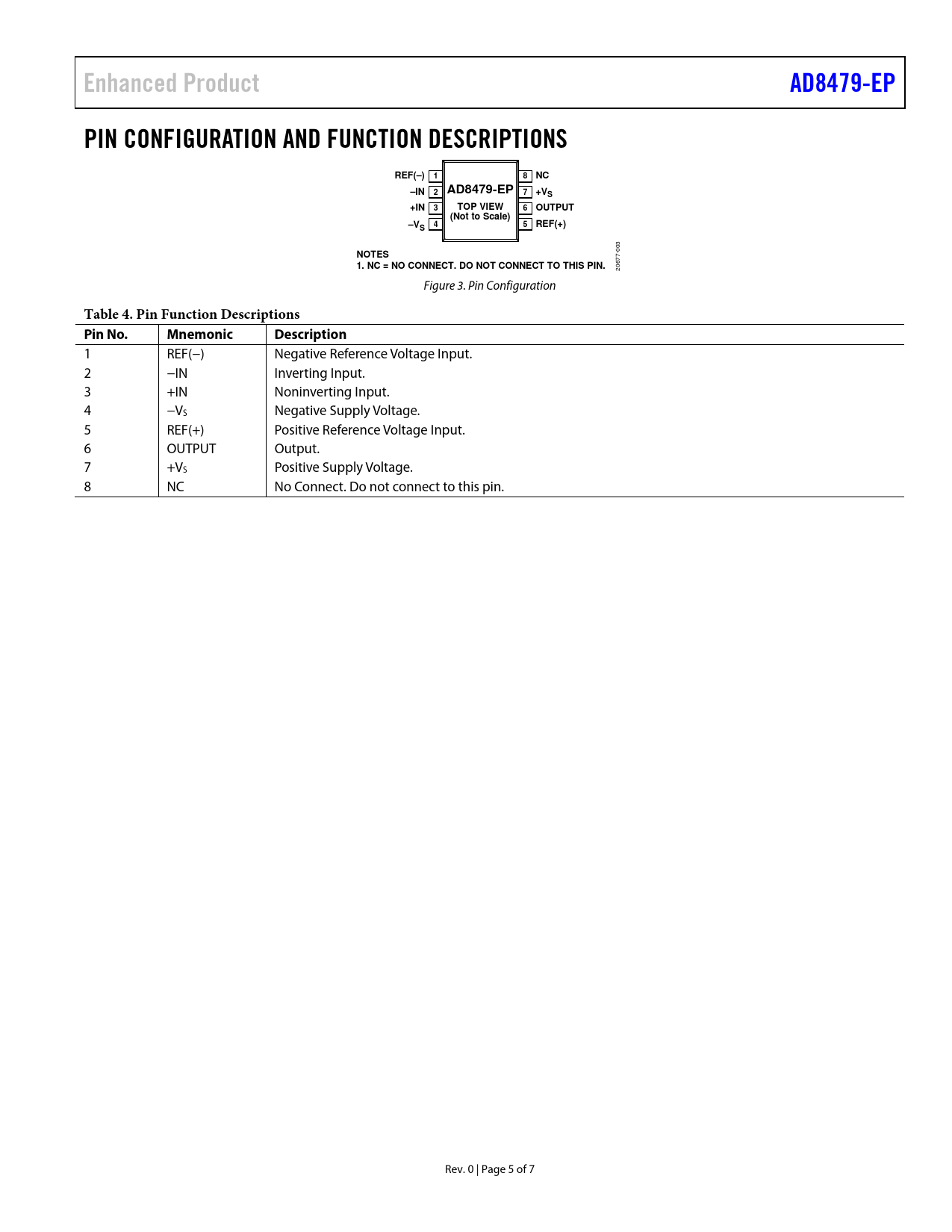 Enhanced Product AD8479-EP PIN CONFIGURATION AND FUNCTION DESCRIPTIONS REF(–) 1 8 NC –IN 2 AD8479-EP 7 +VS +IN 3 TOP VIEW 6 OUTPUT (Not to Scale) –V 4 5 REF(+) S