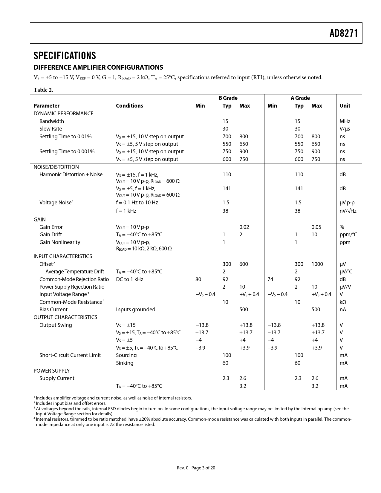 AD8271 SPECIFICATIONS DIFFERENCE AMPLIFIER CONFIGURATIONS Table 2 B Grade A Grade Parameter Conditions Min Typ Max Min Typ