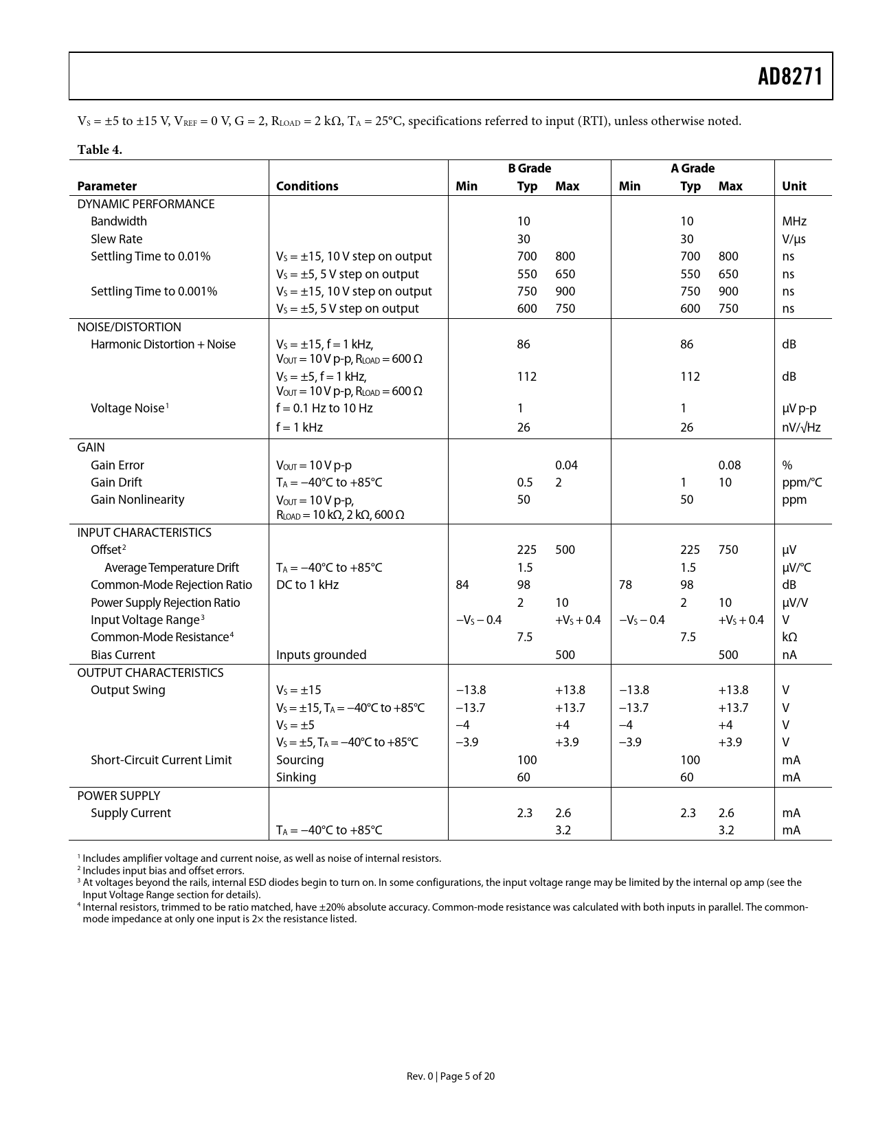 页数 / 页20 / 5 — AD8271. Table 4. B Grade. A Grade. Parameter. Conditions. Min Typ. Max …