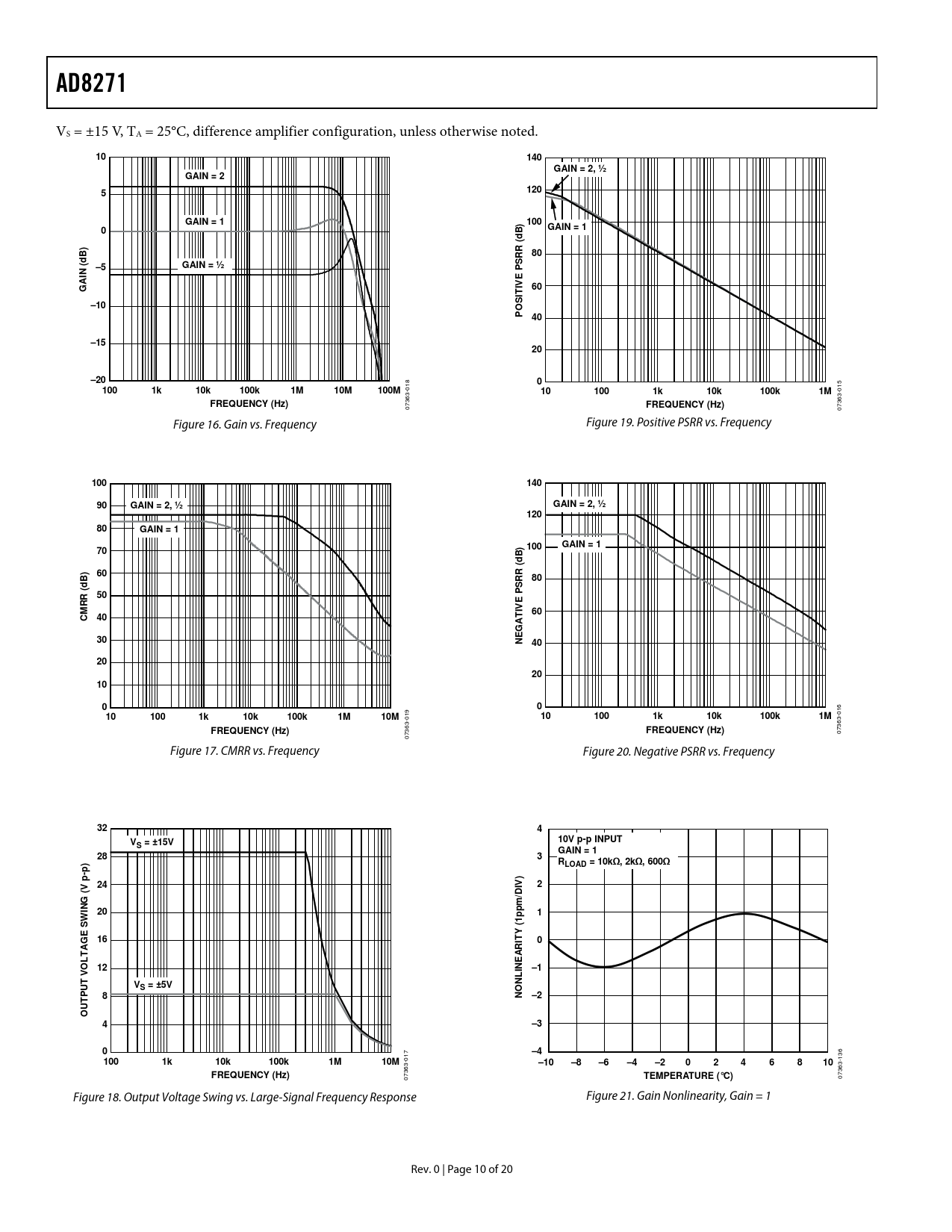AD8271. 140. GAIN = 2, ½. GAIN = 2. 120. GAIN = 1. 100. d (. GAIN = ½. IVE P. T SI. –10. –15. –20. 10k. 100k. 10M. 100M. FREQUENCY (Hz). B) d. RR (. R (. E IV. AT G