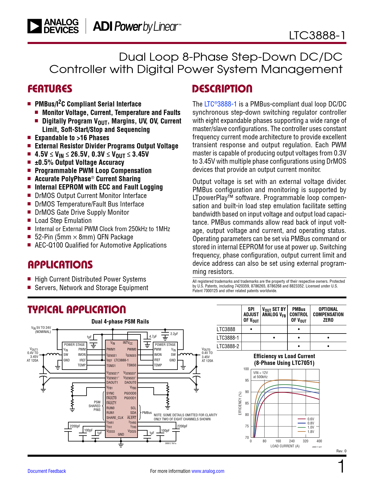LTC3888-1 Dual Loop 8-Phase Step-Down DC/DC Controller with Digital Power System Management FEATURESDESCRIPTION n PMBus/I2C Compliant Serial Interface The LTC®3888-1 is a PMBus-compliant dual loop DC/DC n Monitor Voltage, Current, Temperature and Faults synchronous step-down switching regulator controller n Digitally Program V with eight expandable phases supporting a wide range of OUT, Margins, UV, OV, CurrentLimit, Soft-Start/Stop and Sequencing master/slave configurations. The controller uses constant n Expandable to >16 Phases frequency current mode architecture to provide excellent n External Resistor Divider Programs Output Voltage transient response and output regulation. Each PWM n 4.5V ≤ V master is capable of producing output voltages from 0.3V IN ≤ 26.5V, 0.3V ≤ VOUT ≤ 3.45V n ±0.5% Output Voltage Accuracy to 3.45V with multiple phase configurations using DrMOS n Programmable PWM Loop Compensation devices that provide an output current monitor. n Accurate PolyPhase ® Current Sharing Output voltage is set with an external voltage divider. n Internal EEPROM with ECC and Fault Logging PMBus configuration and monitoring is supported by n DrMOS Output Current Monitor Interface LTpowerPlay™ software. Programmable loop compen- n DrMOS Temperature/Fault Bus Interface sation and built-in load step emulation facilitate setting n DrMOS Gate Drive Supply Monitor bandwidth based on input voltage and output load capaci- n Load Step Emulation tance. PMBus commands allow read back of input volt- n Internal or External PWM Clock from 250kHz to 1MHz age, output voltage and current, and operating status. n 52-Pin (5mm × 8mm) QFN Package Operating parameters can be set via PMBus command or n AEC-Q100 Qualified for Automotive Applications stored in internal EEPROM for use at power up. Switching frequency, phase configuration, output current limit and device address can also be set using external program- APPLICATIONS ming resistors. n High Current Distributed Power Systems All registered trademarks and trademarks are the property of their respective owners. Protected n Servers, Network and Storage Equipment by U.S. Patents, including 7420359, 8786265, 8786268 and 8823352. Licensed under U.S. Patent 7000125 and other related patents worldwide. TYPICAL APPLICATIONSPIVOUT SET BY PMBusOPTIONALADJUST ANALOG VFB CONTROL COMPENSATIONOF VDual 4-phase PSM RailsOUTOF VOUTZERO VIN 5V TO 24V LTC3888 • • (NOMINAL) 2.2µF 1µF 4.7µF LTC3888-1 • • • VIN INTVCC POWER STAGE POWER STAGE LTC3888-2 • • VOUT1 VIN PWM PWM1 PWM0 PWM V V IN OUT0 0.4V TO 0.4V TO 3.45V SW IMON ISENSE1 ISENSE0 IMON SW 3.45V Efficiency vs Load CurrentEfficiency vs Load Current AT 120A GND IREF IREF LTC3888-1 IREF GND AT 120A (8–Phase Using LTC7051)(8-Phase Using LTC7051) TEMP TSNS1 TSNS0 TEMP 100 VSENSE1+ VSENSE0+ VIN = 12V V V at 500kHz SENSE1– SENSE0– 95 DAOUT1 DAOUT0 VFB1 VFB0 90 SYNC PGOOD0 FAULT0 PGOOD1 PSM FAULT1 85 SHARED RUN0 SCL PINS RUN1 SDA PMBus EFFICIENCY (%) NOTE: SOME DETAILS OMITTED FOR CLARITY 80 SHARE_CLK ALERT ONLY TWO OF EIGHT CHANNELS SHOWN 0.6V ITHR1 ITHR0 0.8V 2200pF ITH1 ITH0 2200pF 75 1.0V 100pF VDD33 VDD25 100pF 1.8V 1µF GND 1µF 70 0 80 160 240 320 400 388812 TA01a LOAD CURRENT (A) 3888-1 G01 Rev. 0 Document Feedback For more information www.analog.com 1 Document Outline Features Applications Typical Application Description Absolute Maximum Ratings Order Information Pin Configuration Electrical Characteristics Typical Performance Characteristics Pin Functions Block Diagram Test Circuit Operation Overview About This Document Major Product Features Main Control Loop Power-Up and Initialization Testing Integrity of Output Voltage Sense Analog Output Voltage Control PMBus Output Voltage Control Soft-Start Time-Based Output Sequencing Output Ramping Control Voltage-Based Output Sequencing Output Disable Minimum Output Disable Times Output Short Cycle Switching Frequency and Phase PolyPhase Load Sharing Voltage Control Loop Compensation Load Step Emulation Input Supply Monitoring Output Voltage Sensing and Monitoring Output Current Sensing and Monitoring Temperature Sense Resistor Configuration Pins Internal EEPROM with CRC Fault Detection Input Supply Faults Hardwired PWM Response to Power Stage Faults Hardwired PWM Response to Power Stage UV Hardwired PWM Response to VOUT Faults Power Good Indication Hardwired PWM Response to IOUT Faults Hardwired PWM Response to Internal Temperature Faults External Temperature Faults Timing Faults External Faults Higher-Level Fault Handling Status Registers and ALERT Masking FAULT Pin I/O Fault Log Operation Fault Log Details Factory Default Operation Serial Interface Serial Bus Addressing Serial Bus Timeout Serial Communication Errors PMBus Command Summary PMBus Commands Data Formats Applications Information Efficiency Considerations Power Stage Selection and Interface Using The VDR Monitor Unused TSNS Inputs PWM Frequency and Inductor Selection CIN Selection COUT Selection Programmable Loop Compensation PCB Layout Considerations Output Voltage Sensing Classical Analog Output Voltage Control PMBus Output Voltage Control Using Output Voltage Servo Soft-Start and Stop Time-Based Output Sequencing and Ramping Voltage-Based Output Sequencing PWM Frequency Synchronization PolyPhase Operation and Load Sharing Resistor Configuration Pins Internal Regulator Outputs IC Junction Temperature Derating EEPROM Retention at Temperature Configuring Open-Drain Pins PMBus Communication and Command Processing Status and Fault Log Management LTpowerPlay – An Interactive Digital Power GUI Interfacing to the DC1613 Design Example PMBus Command Details Addressing and Write Protect PAGE PAGE_PLUS_WRITE PAGE_PLUS_READ WRITE_PROTECT MFR_ADDRESS MFR_RAIL_ADDRESS General Device Configuration PMBUS_REVISION CAPABILITY MFR_CONFIG_ALL On, Off and Margin Control ON_OFF_CONFIG OPERATION MFR_RESET PWM Configuration FREQUENCY_SWITCH MFR_CHAN_CONFIG MFR_PWM_CONFIG_LTC3888-1 MFR_PWM