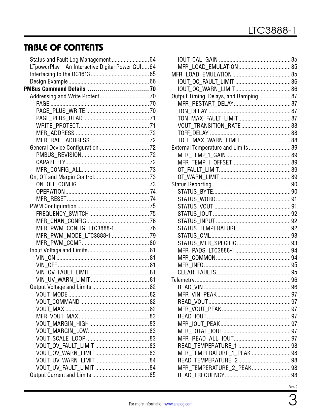 link to page 64 link to page 64 link to page 65 link to page 66 link to page 70 link to page 70 link to page 70 link to page 70 link to page 71 link to page 71 link to page 72 link to page 72 link to page 72 link to page 72 link to page 72 link to page 73 link to page 73 link to page 73 link to page 74 link to page 74 link to page 75 link to page 75 link to page 76 link to page 76 link to page 79 link to page 80 link to page 81 link to page 81 link to page 81 link to page 81 link to page 81 link to page 82 link to page 82 link to page 82 link to page 82 link to page 83 link to page 83 link to page 83 link to page 83 link to page 83 link to page 83 link to page 84 link to page 84 link to page 85 link to page 85 link to page 85 link to page 85 link to page 86 link to page 86 link to page 87 link to page 87 link to page 87 link to page 87 link to page 88 link to page 88 link to page 88 link to page 89 link to page 89 link to page 89 link to page 89 link to page 89 link to page 90 link to page 90 link to page 91 link to page 91 link to page 92 link to page 92 link to page 92 link to page 93 link to page 93 link to page 94 link to page 94 link to page 95 link to page 95 link to page 96 link to page 96 link to page 97 link to page 97 link to page 97 link to page 97 link to page 97 link to page 97 link to page 97 link to page 98 link to page 98 link to page 98 link to page 98 link to page 98 LTC3888-1 TABLE OF CONTENTS Status and Fault Log Management ...64 IOUT_CAL_GAIN ..85 LTpowerPlay – An Interactive Digital Power GUI ...64 MFR_LOAD_EMULATION ...85 Interfacing to the DC1613 ...65 MFR_LOAD_EMULATION ...85 Design Example ..66 IOUT_OC_FAULT_LIMIT ...86 PMBus Command Details ...70 IOUT_OC_WARN_LIMIT ...86 Addressing and Write Protect ...70 Output Timing, Delays, and Ramping ...87 PAGE ..70 MFR_RESTART_DELAY ..87 PAGE_PLUS_WRITE ..70 TON_DELAY ...87 PAGE_PLUS_READ ..71 TON_MAX_FAULT_LIMIT ...87 WRITE_PROTECT ...71 VOUT_TRANSITION_RATE ...88 MFR_ADDRESS ...72 TOFF_DELAY ..88 MFR_RAIL_ADDRESS ...72 TOFF_MAX_WARN_LIMIT ..88 General Device Configuration ...72 External Temperature and Limits ..89 PMBUS_REVISION ...72 MFR_TEMP_1_GAIN ...89 CAPABILITY ..72 MFR_TEMP_1_OFFSET ...89 MFR_CONFIG_ALL ...73 OT_FAULT_LIMIT ..89 On, Off and Margin Control ...73 OT_WARN_LIMIT ...89 ON_OFF_CONFIG ..73 Status Reporting ...90 OPERATION .. 74 STATUS_BYTE ..90 MFR_RESET ... 74 STATUS_WORD ..91 PWM Configuration ..75 STATUS_VOUT ...91 FREQUENCY_SWITCH ..75 STATUS_IOUT ..92 MFR_CHAN_CONFIG ..76 STATUS_INPUT ..92 MFR_PWM_CONFIG_LTC3888-1 ...76 STATUS_TEMPERATURE ..92 MFR_PWM_MODE_LTC3888-1 ...79 STATUS_CML ...93 MFR_PWM_COMP ...80 STATUS_MFR_SPECIFIC ..93 Input Voltage and Limits ...81 MFR_PADS_LTC3888-1 ...94 VIN_ON ..81 MFR_COMMON ..94 VIN_OFF ...81 MFR_INFO ..95 VIN_OV_FAULT_LIMIT ..81 CLEAR_FAULTS..95 VIN_UV_WARN_LIMIT ...81 Telemetry ..96 Output Voltage and Limits ..82 READ_VIN ..96 VOUT_MODE ..82 MFR_VIN_PEAK ...97 VOUT_COMMAND ..82 READ_VOUT ...97 VOUT_MAX ..82 MFR_VOUT_PEAK ..97 MFR_VOUT_MAX ...83 READ_IOUT ..97 VOUT_MARGIN_HIGH ..83 MFR_IOUT_PEAK ...97 VOUT_MARGIN_LOW...83 MFR_TOTAL_IOUT ...97 VOUT_SCALE_LOOP ..83 MFR_READ_ALL_IOUT ..97 VOUT_OV_FAULT_LIMIT ..83 READ_TEMPERATURE_1 ...98 VOUT_OV_WARN_LIMIT ..83 MFR_TEMPERATURE_1_PEAK ..98 VOUT_UV_WARN_LIMIT ..84 READ_TEMPERATURE_2 ...98 VOUT_UV_FAULT_LIMIT ..84 MFR_TEMPERATURE_2_PEAK ..98 Output Current and Limits ..85 READ_FREQUENCY ..98 Rev. 0 For more information www.analog.com 3 Document Outline Features Applications Typical Application Description Absolute Maximum Ratings Order Information Pin Configuration Electrical Characteristics Typical Performance Characteristics Pin Functions Block Diagram Test Circuit Operation Overview About This Document Major Product Features Main Control Loop Power-Up and Initialization Testing Integrity of Output Voltage Sense Analog Output Voltage Control PMBus Output Voltage Control Soft-Start Time-Based Output Sequencing Output Ramping Control Voltage-Based Output Sequencing Output Disable Minimum Output Disable Times Output Short Cycle Switching Frequency and Phase PolyPhase Load Sharing Voltage Control Loop Compensation Load Step Emulation Input Supply Monitoring Output Voltage Sensing and Monitoring Output Current Sensing and Monitoring Temperature Sense Resistor Configuration Pins Internal EEPROM with CRC Fault Detection Input Supply Faults Hardwired PWM Response to Power Stage Faults Hardwired PWM Response to Power Stage UV Hardwired PWM Response to VOUT Faults Power Good Indication Hardwired PWM Response to IOUT Faults Hardwired PWM Response to Internal Temperature Faults External Temperature Faults Timing Faults External Faults Higher-Level Fault Handling Status Registers and ALERT Masking FAULT Pin I/O Fault Log Operation Fault Log Details Factory Default Operation Serial Interface Serial Bus Addressing Serial Bus Timeout Serial Communication Errors PMBus Command Summary PMBus Commands Data Formats Applications Information Efficiency Considerations Power Stage Selection and Interface Using The VDR Monitor Unused TSNS Inputs PWM Frequency and Inductor Selection CIN Selection COUT Selection Programmable Loop Compensation PCB Layout Considerations Output Voltage Sensing Classical Analog Output Voltage Control PMBus Output Voltage Control Using Output Voltage Servo Soft-Start and Stop Time-Based Output Sequencing and Ramping Voltage-Based Output Sequencing PWM Frequency Synchronization PolyPhase Operation and Load Sharing Resistor Configuration Pins Internal Regulator Outputs IC Junction Temperature Derating EEPROM Retention at Temperature Configuring Open-Drain Pins PMBus Communication and Command Processing Status and Fault Log Management LTpowerPlay – An Interactive Digital Power GUI Interfacing to the DC1613 Design Example PMBus Command Details Addressing and Write Protect PAGE PAGE_PLUS_WRITE PAGE_PLUS_READ WRITE_PROTECT MFR_ADDRESS MFR_RAIL_ADDRESS General Device Configuration PMBUS_REVISION CAPABILITY MFR_CONFIG