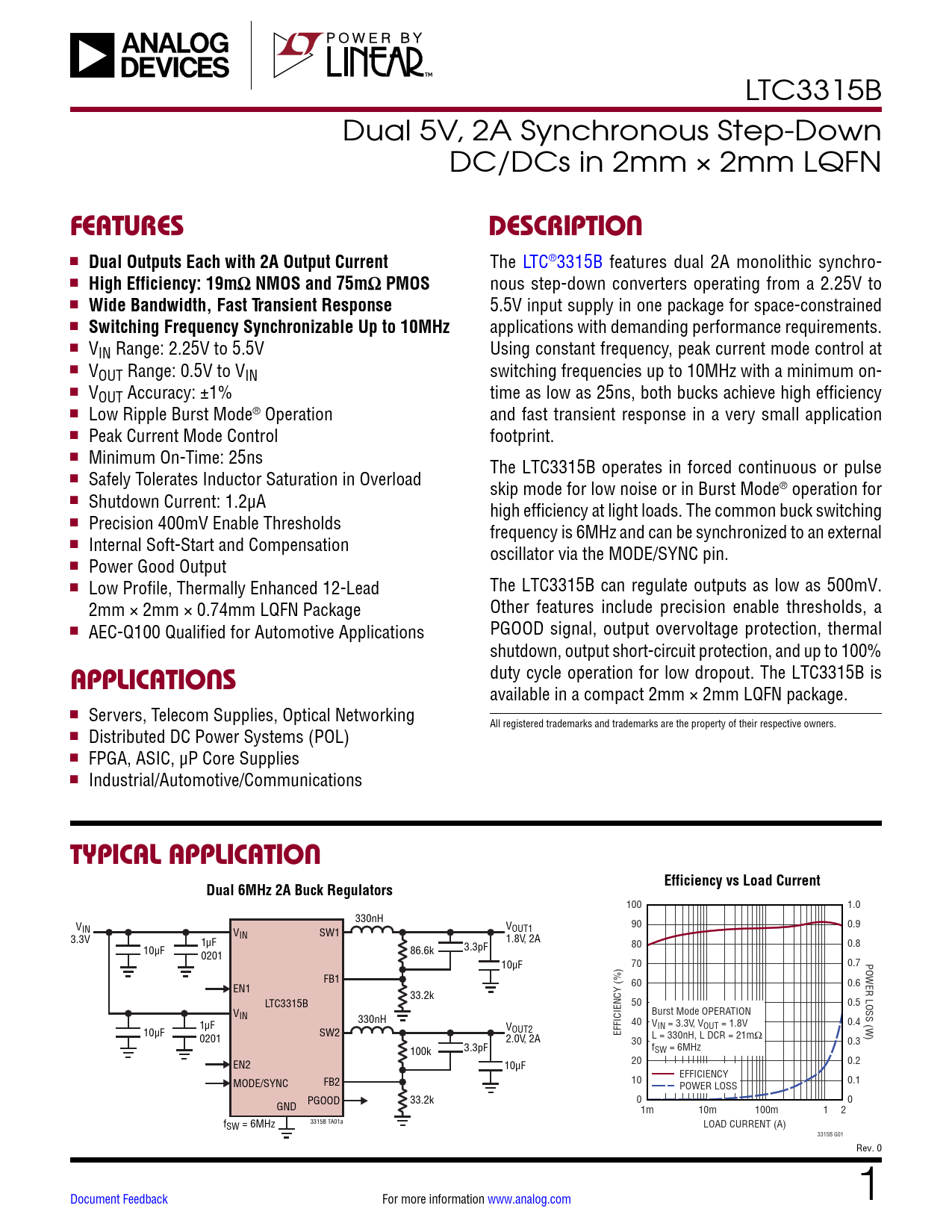 available in a compact 2mm × 2mm LQFN package. n Servers, Telecom Supplies, Optical Networking All registered trademarks and trademarks are the property of their respective owners. n Distributed DC Power Systems (POL) n FPGA, ASIC, µP Core Supplies n Industrial/Automotive/Communications