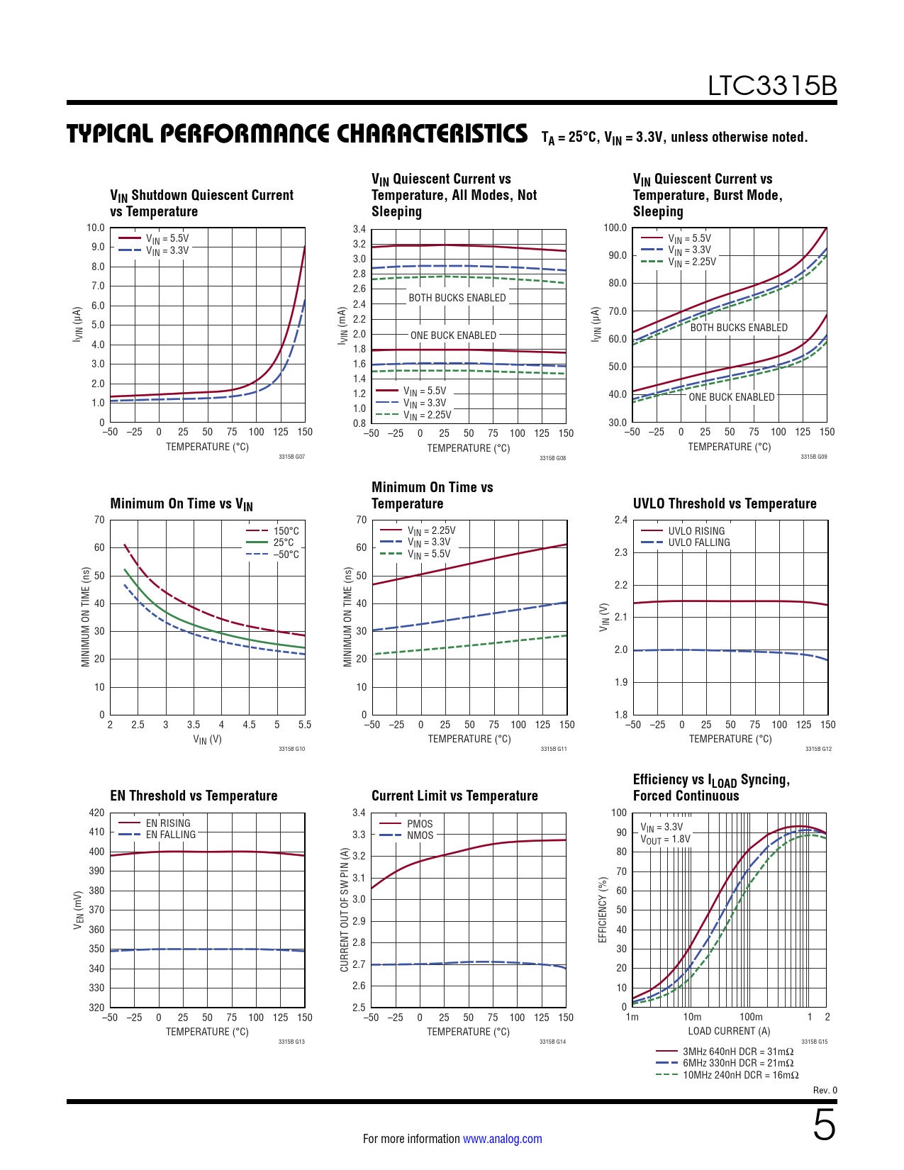 70 70 2.4 150°C VIN = 2.25V UVLO RISING 25°C 60 VIN = 3.3V 60 UVLO FALLING –50°C VIN = 5.5V 2.3 50 50 2.2 40 40 (V) 2.1 30 30 V IN 2.0 20 MINIMUM ON TIME (ns) 20 MINIMUM ON TIME (ns) 10 10 1.9 0 0 1.8 2 2.5 3 3.5 4 4.5 5 5.5 –50 –25 0 25 50 75 100 125 150 –50 –25 0 25 50 75 100 125 150 VIN (V) TEMPERATURE (°C) TEMPERATURE (°C) 3315B G10 3315B G11 3315B G12