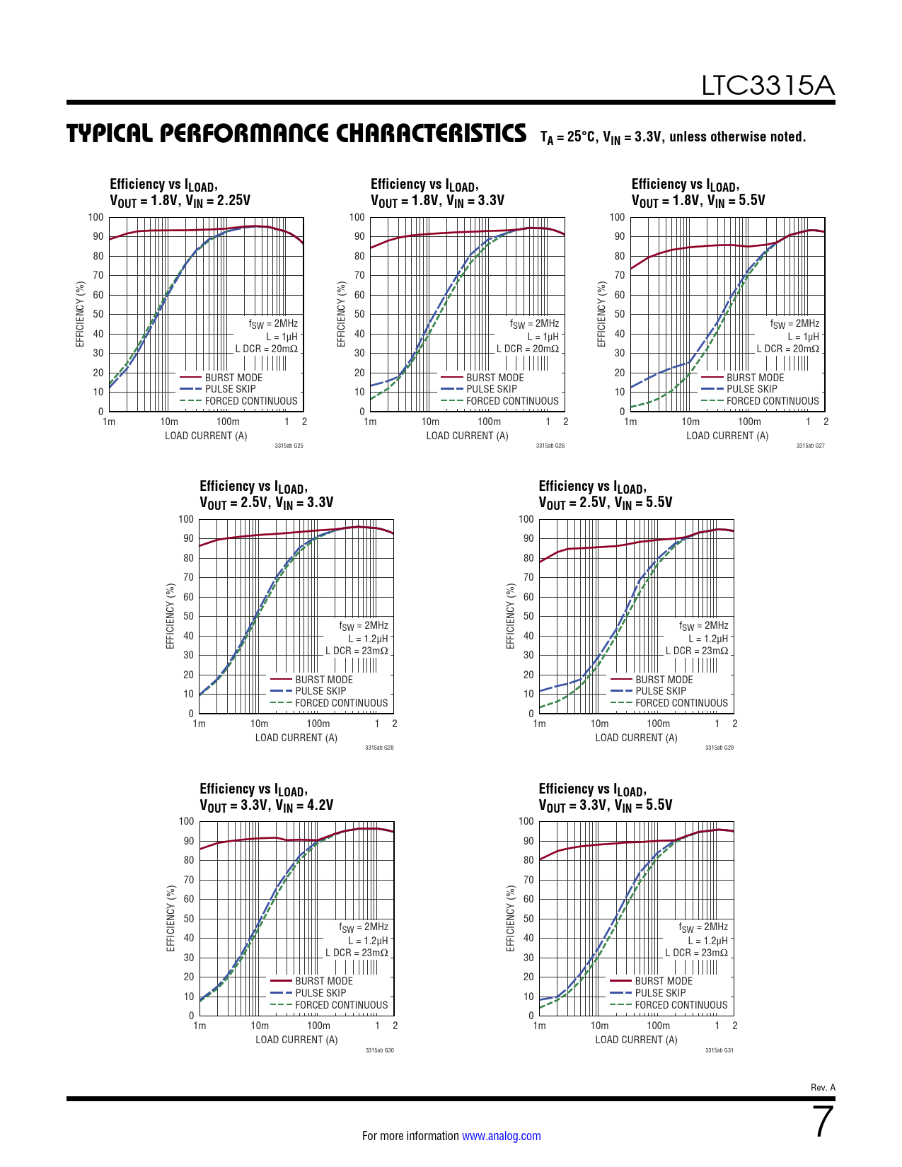 100 100 100 90 90 90 80 80 80 70 70 70 60 60 60 50 50 50 fSW = 2MHz fSW = 2MHz fSW = 2MHz 40 L = 1µH 40 L = 1µH 40 L = 1µH EFFICIENCY (%) EFFICIENCY (%) EFFICIENCY (%) 30 L DCR = 20mΩ 30 L DCR = 20mΩ 30 L DCR = 20mΩ 20 BURST MODE 20 BURST MODE 20 BURST MODE 10 PULSE SKIP 10 PULSE SKIP 10 PULSE SKIP FORCED CONTINUOUS FORCED CONTINUOUS FORCED CONTINUOUS 0 0 0 1m 10m 100m 1 2 1m 10m 100m 1 2 1m 10m 100m 1 2 LOAD CURRENT (A) LOAD CURRENT (A) LOAD CURRENT (A) 3315ab G25 3315ab G26 3315ab G27