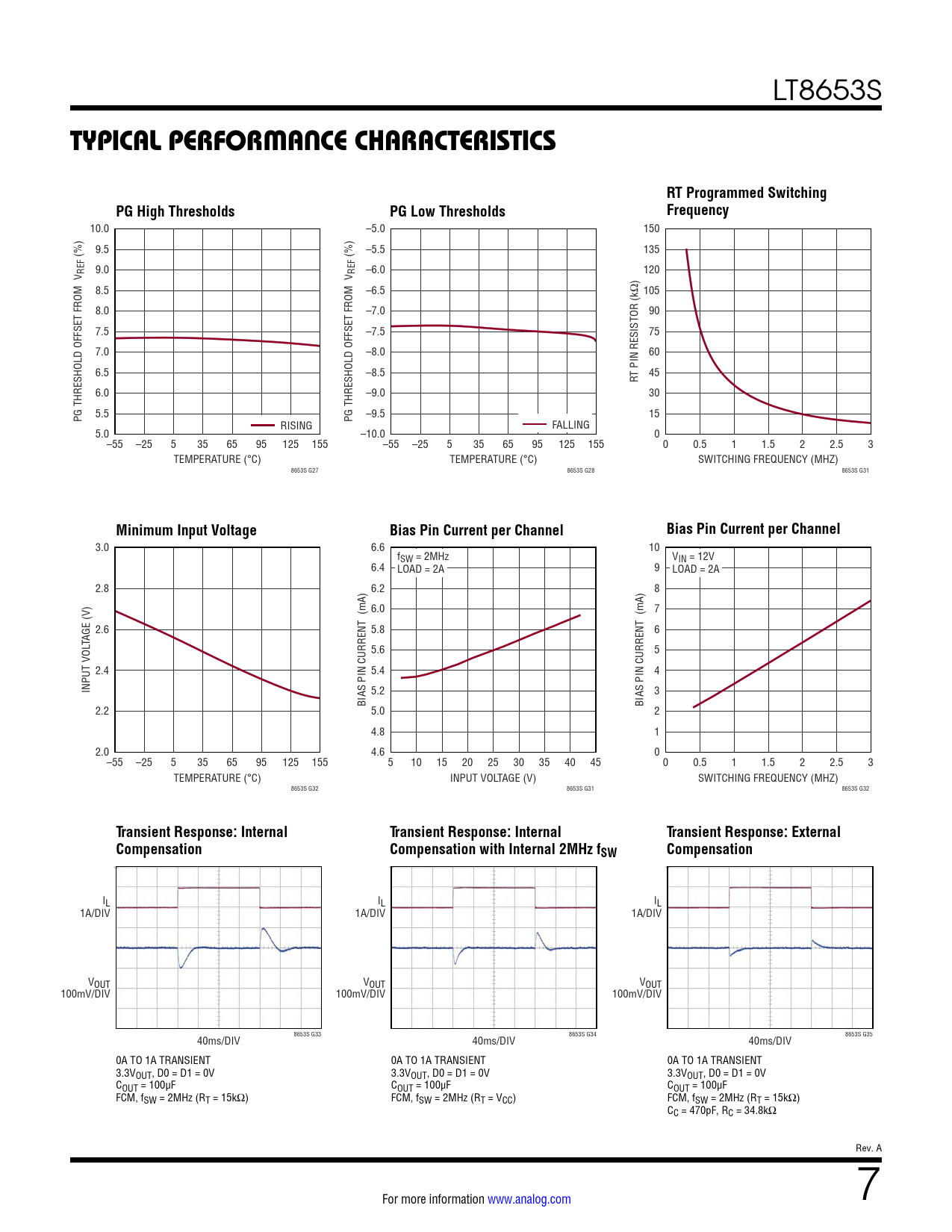 10.0 –5.0 150 9.5 (%) –5.5 (%) 135 REF 9.0 REF –6.0 120 8.5 –6.5 105 8.0 –7.0 90 7.5 –7.5 75 7.0 –8.0 60 6.5 –8.5 45 RT PIN RESISTOR (kΩ) 6.0 –9.0 30 5.5 PG THRESHOLD OFFSET FROM V –9.5 PG THRESHOLD OFFSET FROM V 15 RISING FALLING 5.0 –10.0 0 –55 –25 5 35 65 95 125 155 –55 –25 5 35 65 95 125 155 0 0.5 1 1.5 2 2.5 3 TEMPERATURE (°C) TEMPERATURE (°C) SWITCHING FREQUENCY (MHZ) 8653S G27 8653S G28 8653S G31