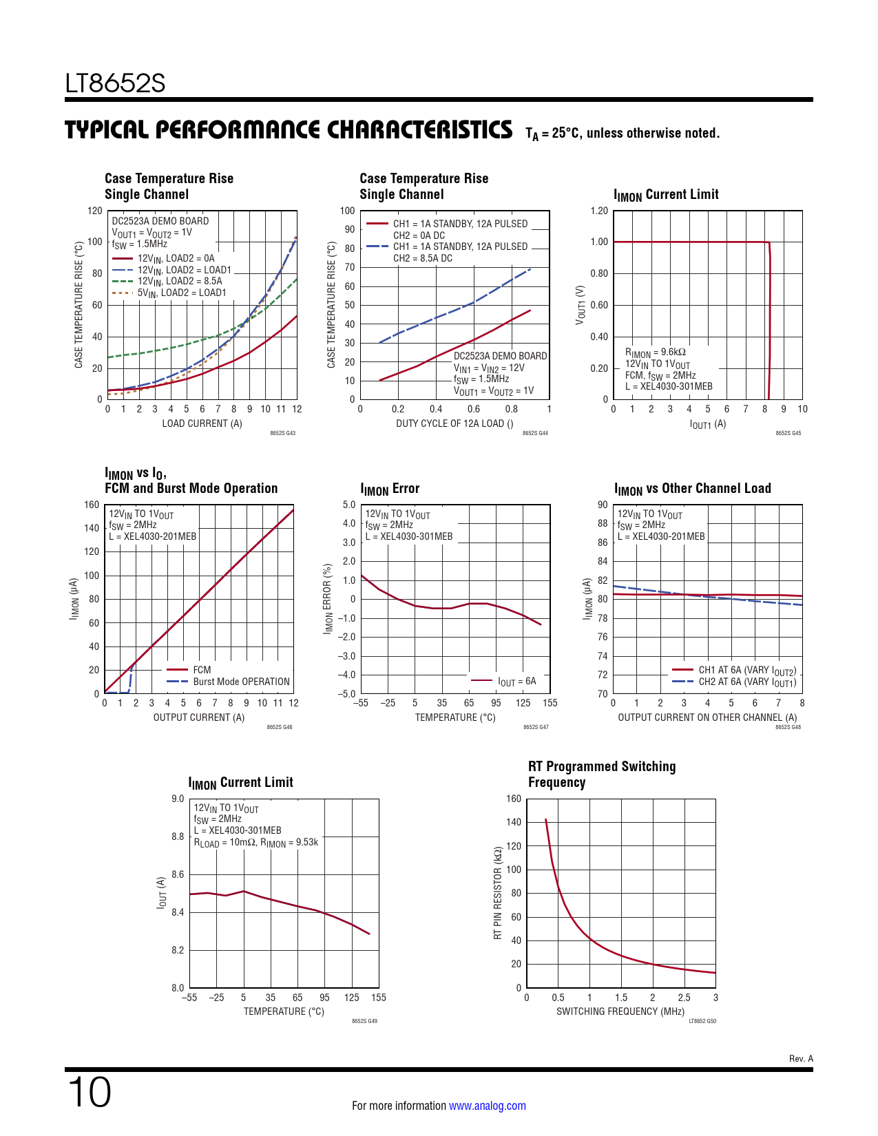 160 5.0 90 12VIN TO 1VOUT 12VIN TO 1VOUT 12VIN TO 1VOUT f 140 SW = 2MHz 4.0 fSW = 2MHz 88 fSW = 2MHz L = XEL4030-201MEB 3.0 L = XEL4030-301MEB L = XEL4030-201MEB 86 120 2.0 84 100 1.0 82 (µA) 80 0 (µA) 80 ERROR (%) I IMON 60 –1.0 I IMON 78 I IMON –2.0 76 40 –3.0 74 20 FCM –4.0 CH1 AT 6A (VARY IOUT2) 72 Burst Mode OPERATION IOUT = 6A CH2 AT 6A (VARY IOUT1) 0 –5.0 70 0 1 2 3 4 5 6 7 8 9 10 11 12 –55 –25 5 35 65 95 125 155 0 1 2 3 4 5 6 7 8 OUTPUT CURRENT (A) TEMPERATURE (°C) OUTPUT CURRENT ON OTHER CHANNEL (A) 8652S G46 8652S G47 8652S G48